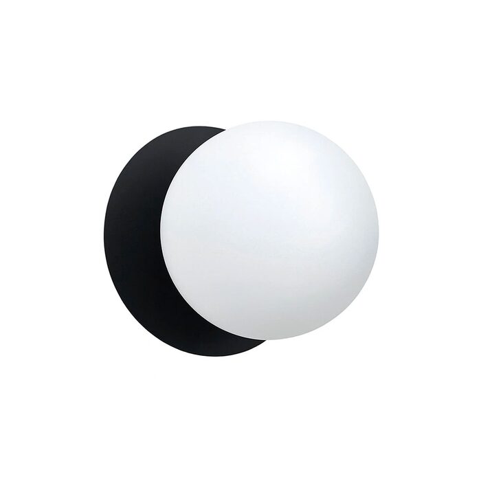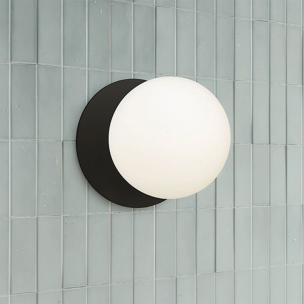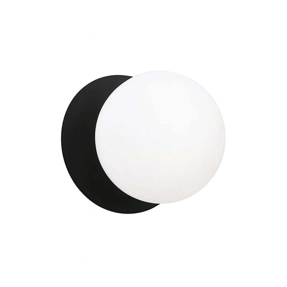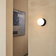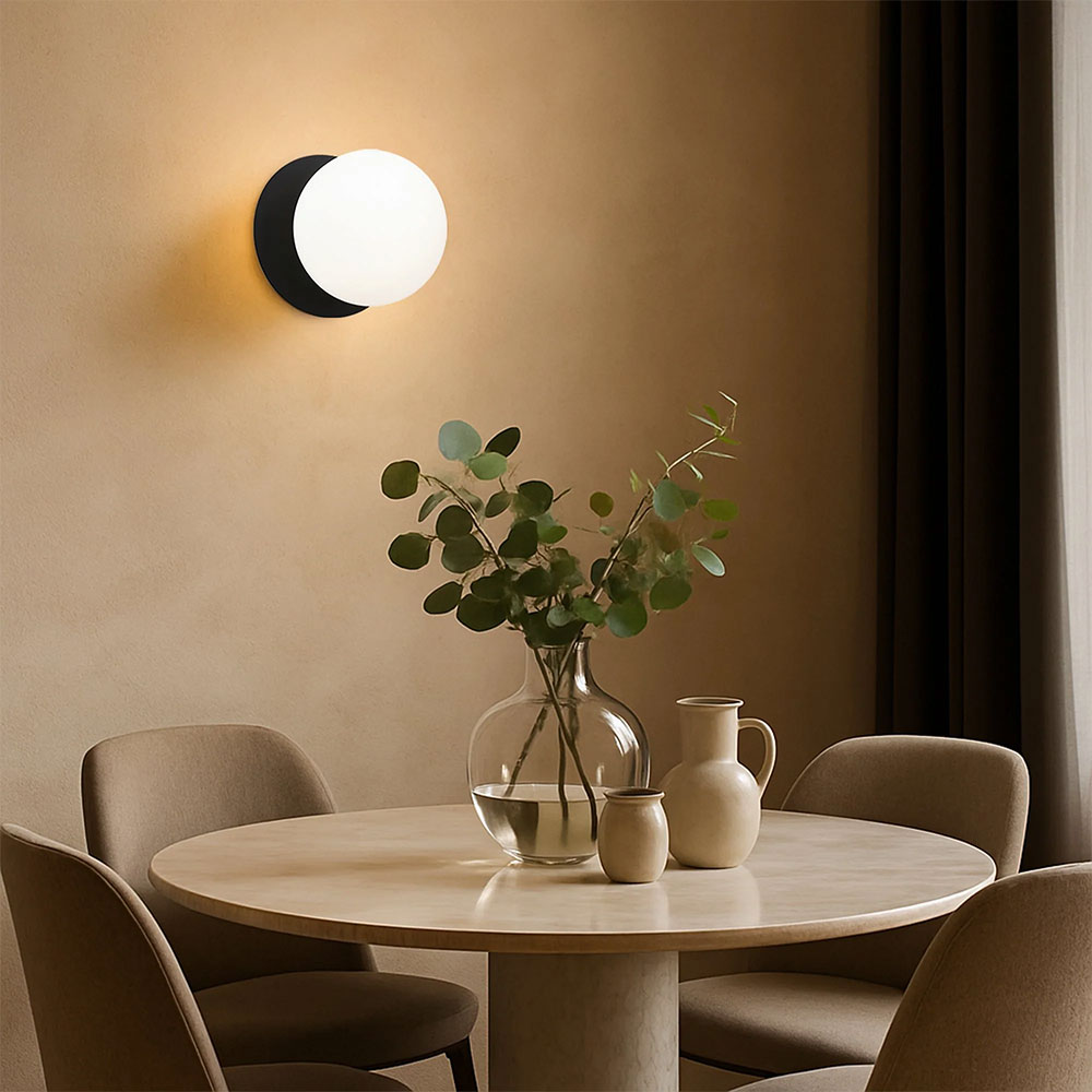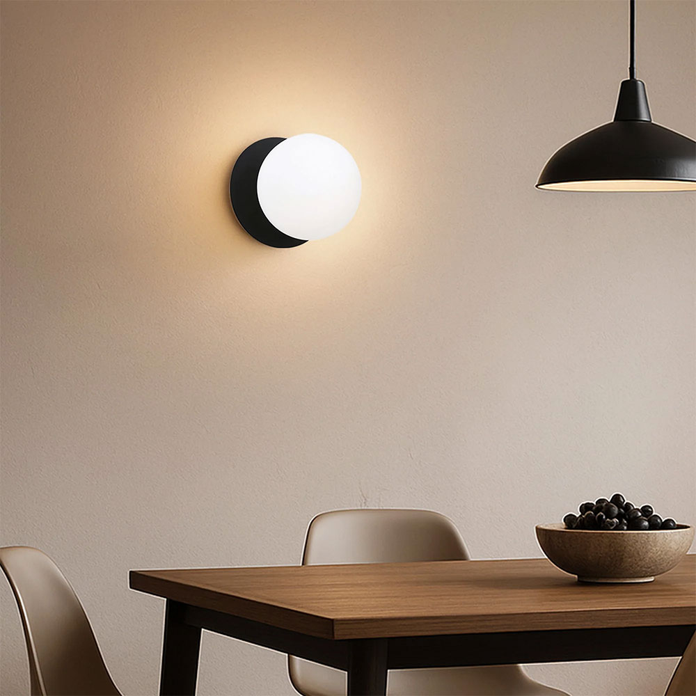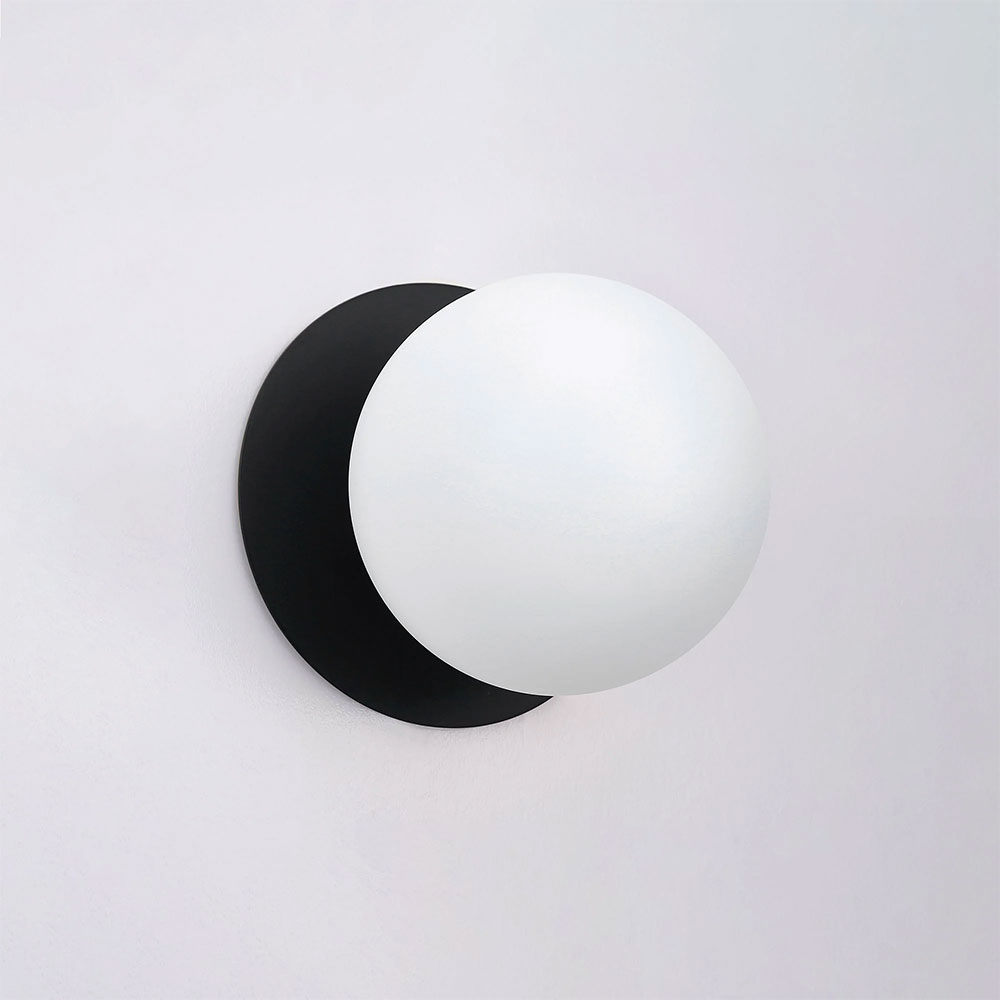 Each wall light pairs a sleek integrated LED module with your choice of round decorative base plate in Gold, Brass, Chrome, Matte White, or Matte Black, and a round glass shade available in Clear, Smoky, Marble Opal, or Frosted Opal, in 10 cm or 15 cm sizes.