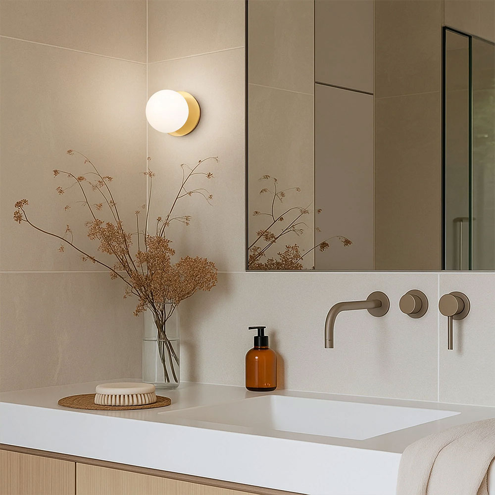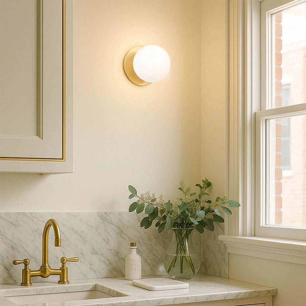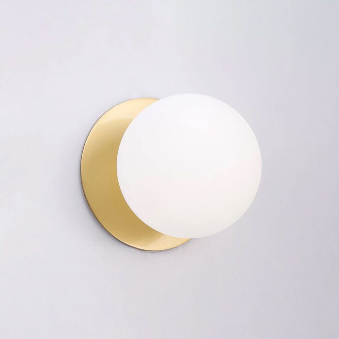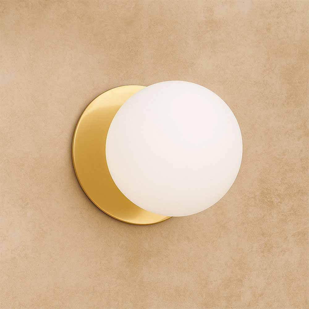 Each wall light pairs a sleek integrated LED module with your choice of round decorative base plate in Gold, Brass, Chrome, Matte White, or Matte Black, and a round glass shade available in Clear, Smoky, Marble Opal, or Frosted Opal, in 10 cm or 15 cm sizes.