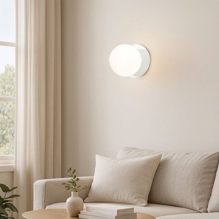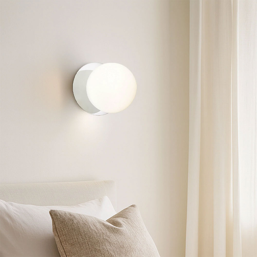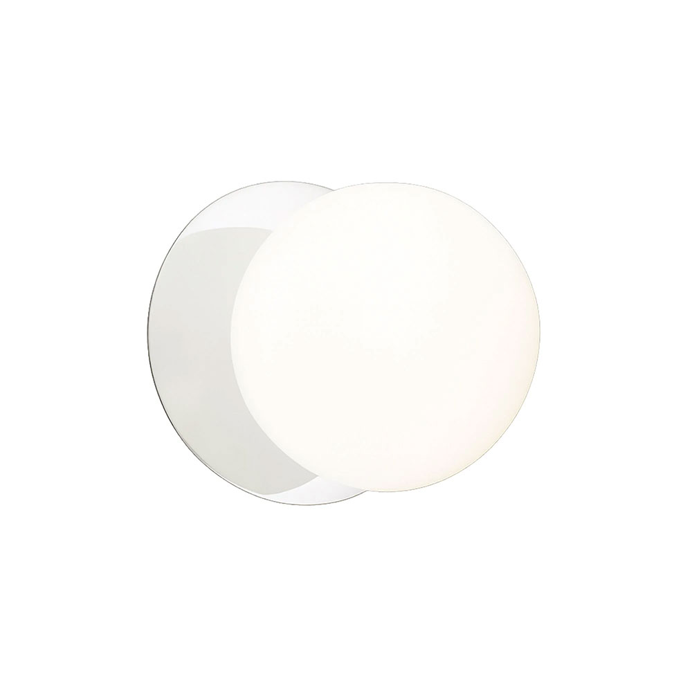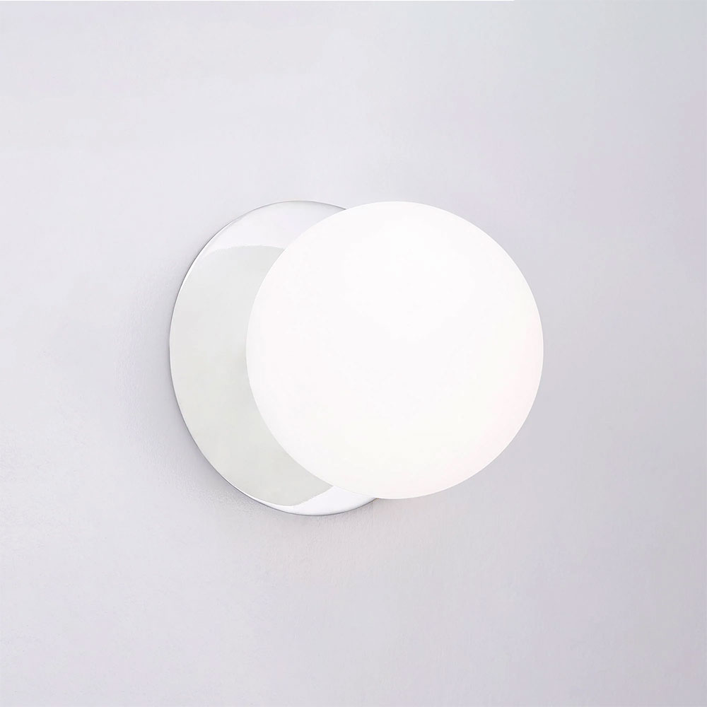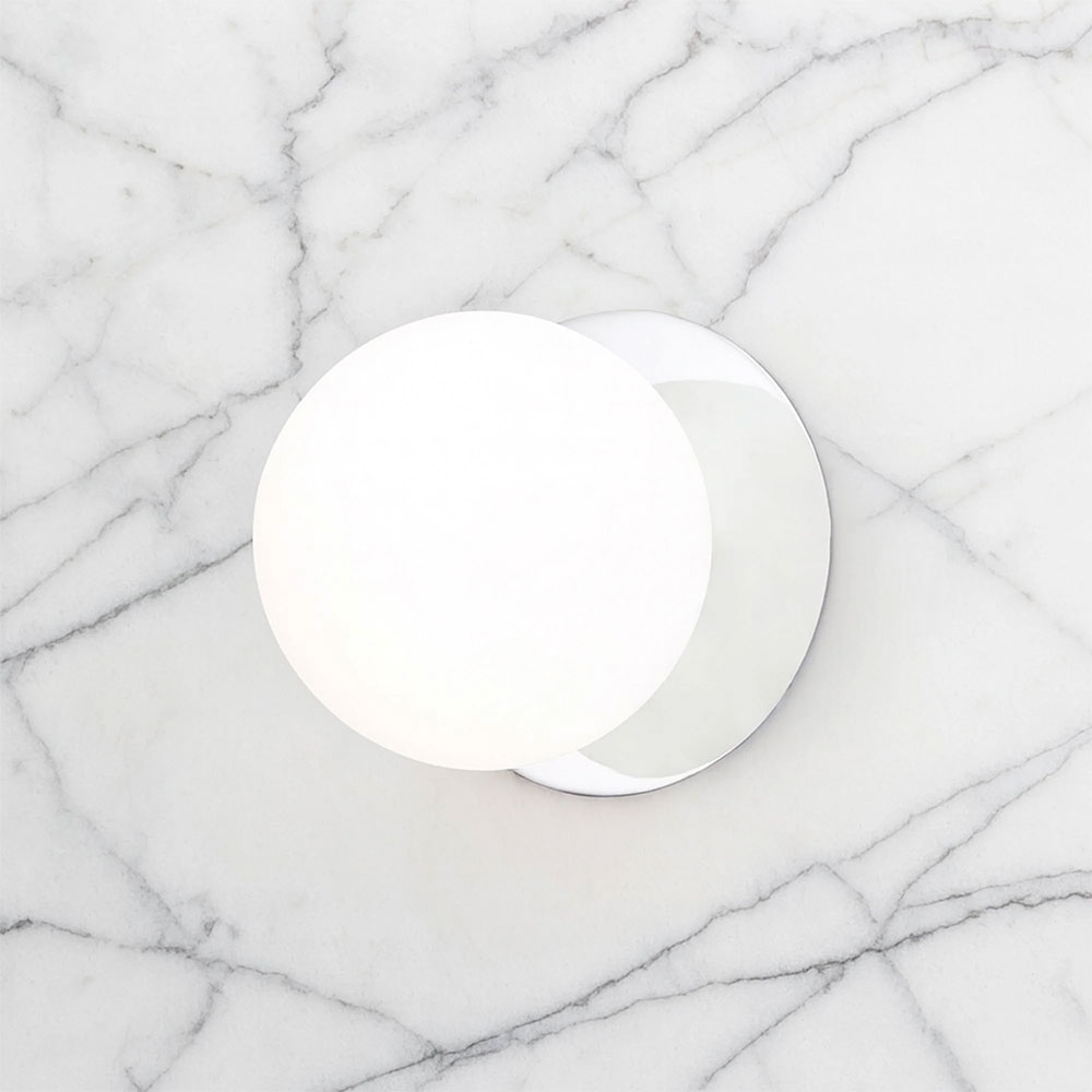Each wall light pairs a sleek integrated LED module with your choice of round decorative base plate in Gold, Brass, Chrome, Matte White, or Matte Black, and a round glass shade available in Clear, Smoky, Marble Opal, or Frosted Opal, in 10 cm or 15 cm sizes.