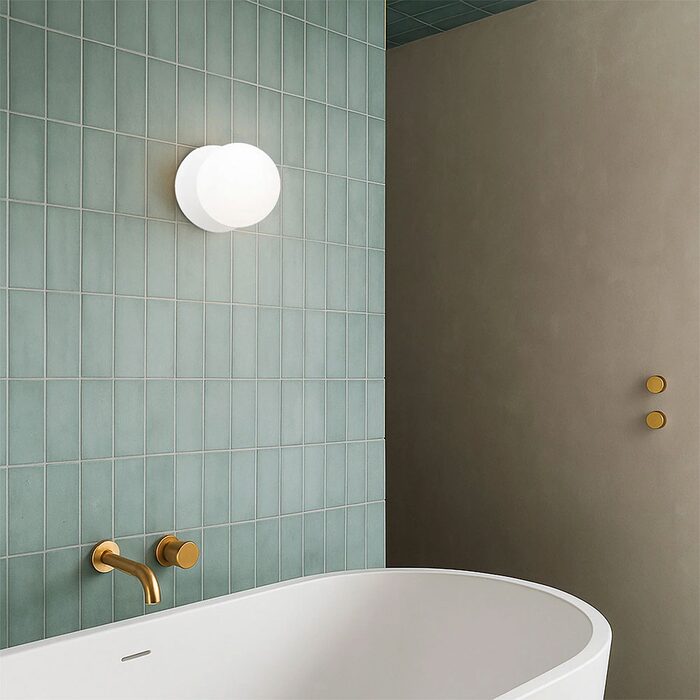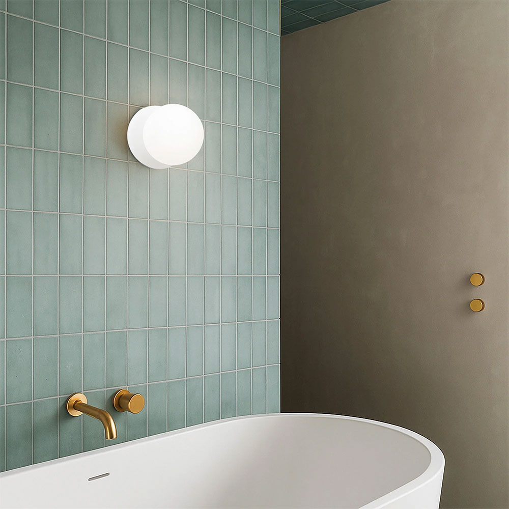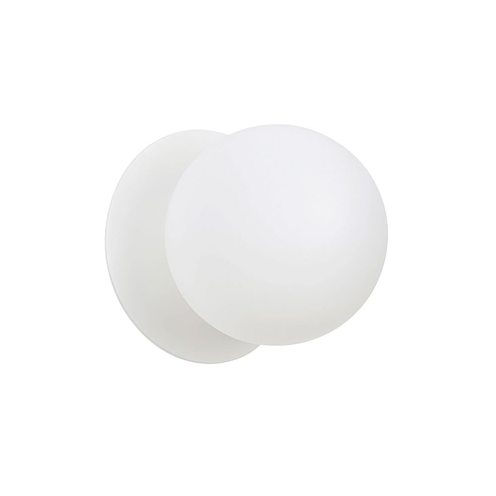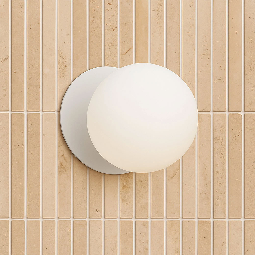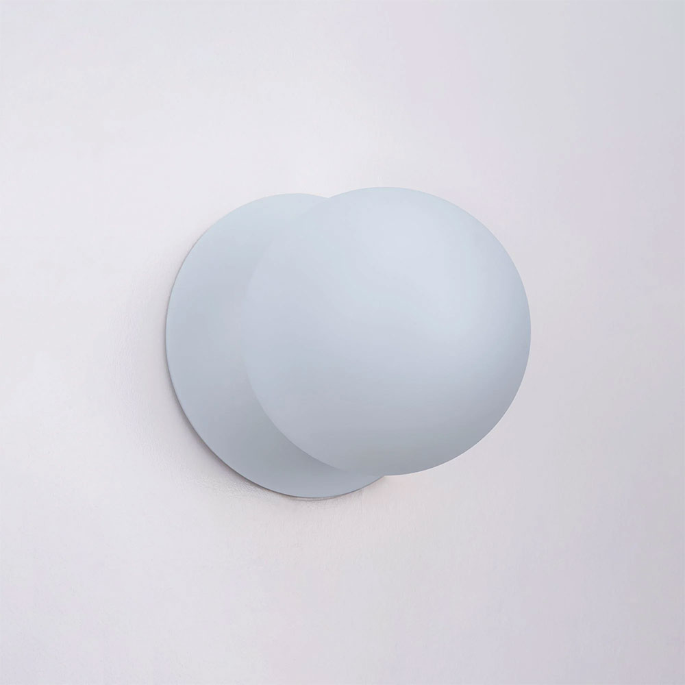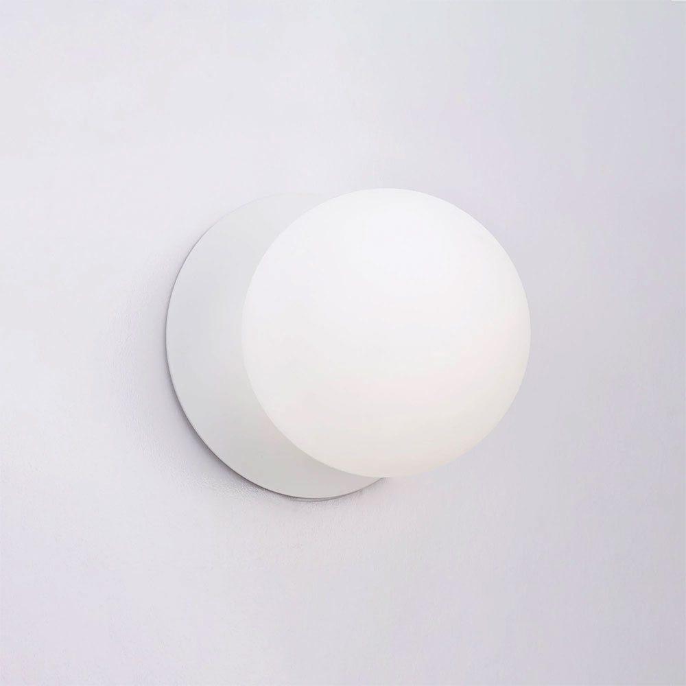 Each wall light pairs a sleek integrated LED module with your choice of round decorative base plate in Gold, Brass, Chrome, Matte White, or Matte Black, and a round glass shade available in Clear, Smoky, Marble Opal, or Frosted Opal, in 10 cm or 15 cm sizes.
