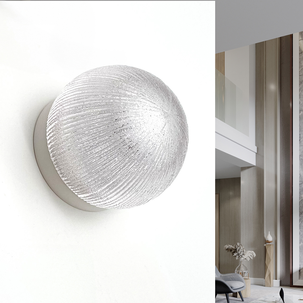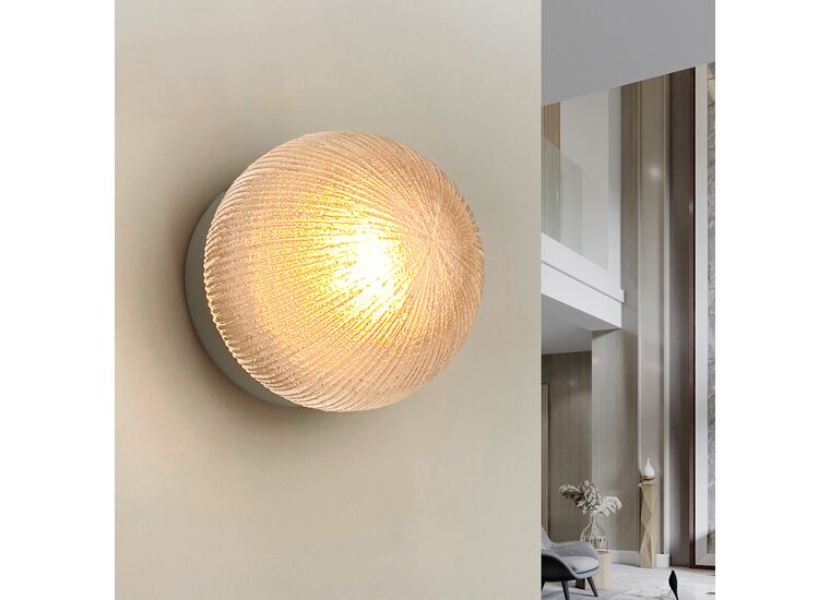 Introducing the Olympus White glass wall light, a beautifully crafted fixture that presents an eye-catching symmetrical lined pattern, effortlessly bringing a touch of brilliance to your walls.