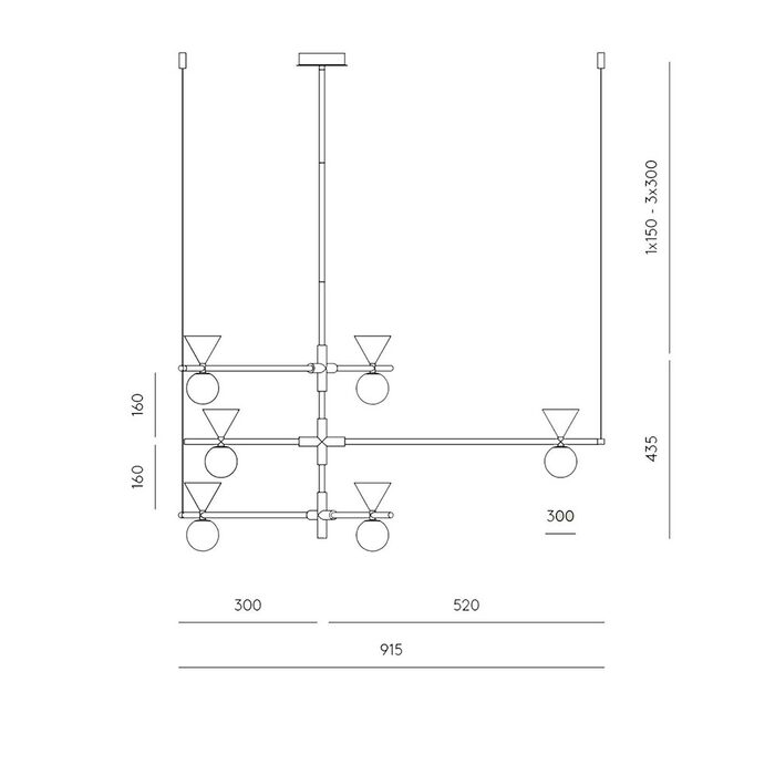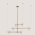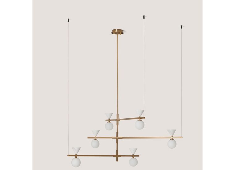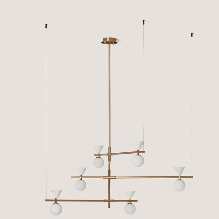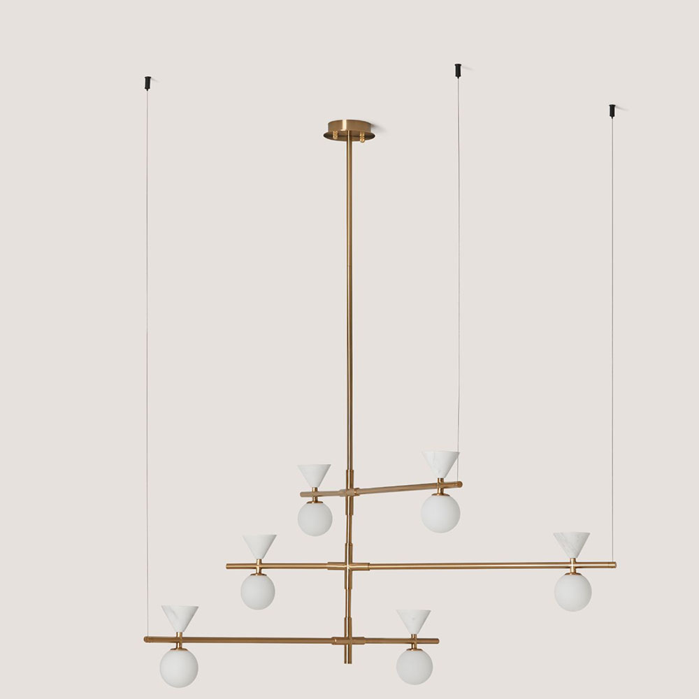 The marble cones above each opal glass shade evoke an interplay of sleek forms while the asymmetrical structure emphasises a balance between the solid and the fragile.