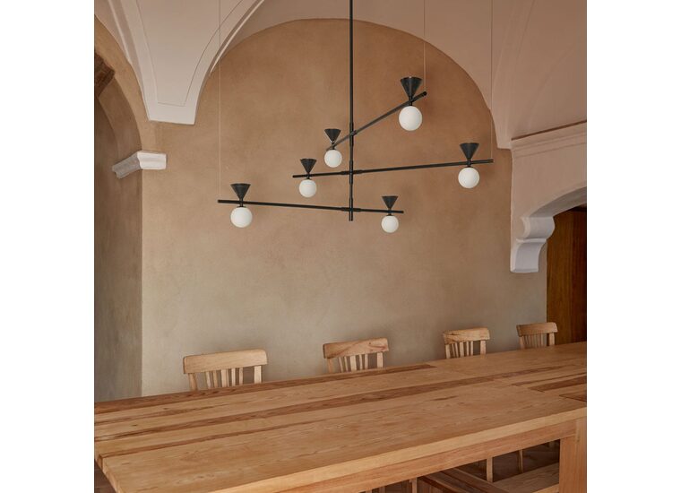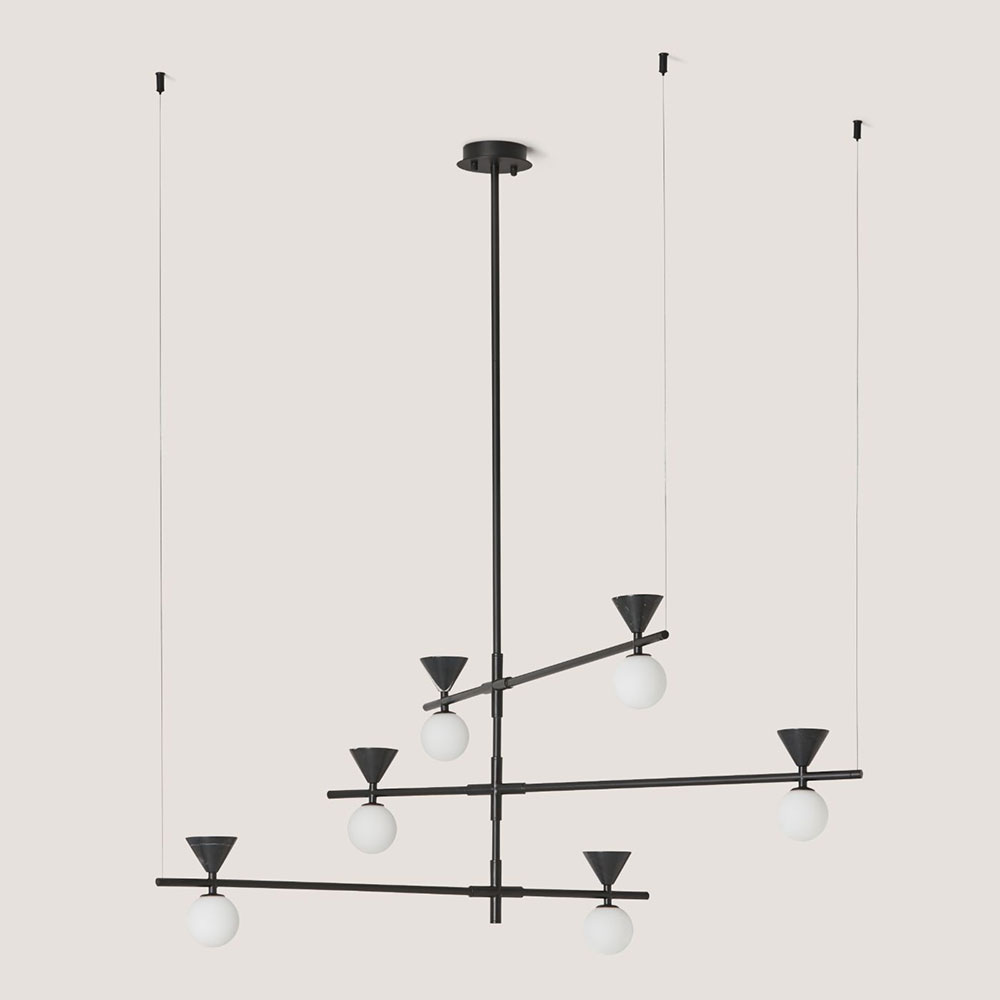 The marble cones above each opal glass shade evoke an interplay of sleek forms while the asymmetrical structure emphasises a balance between the solid and the fragile.