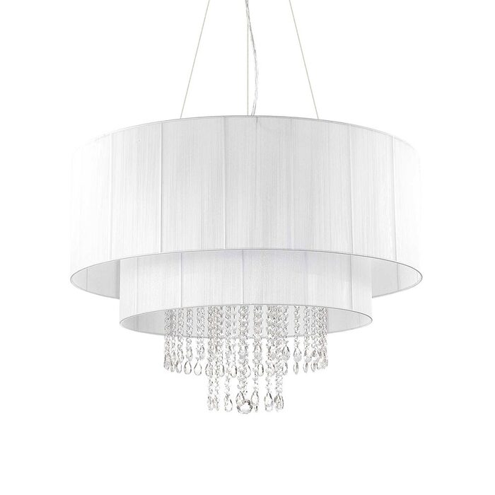 Chrome frame. Lampshade in PVC foil with metallic reflections and covered with threads. Cut crystal pendants. Suspensions with adjustable length steel cables.