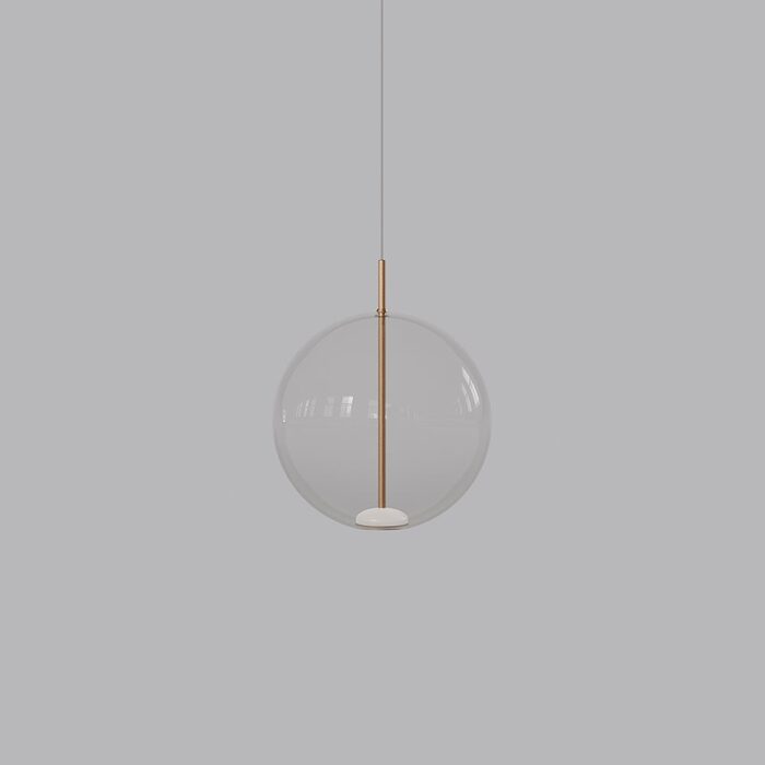 A refined brass rod intersects the sphere, housing a radiant dimmable LED light source.