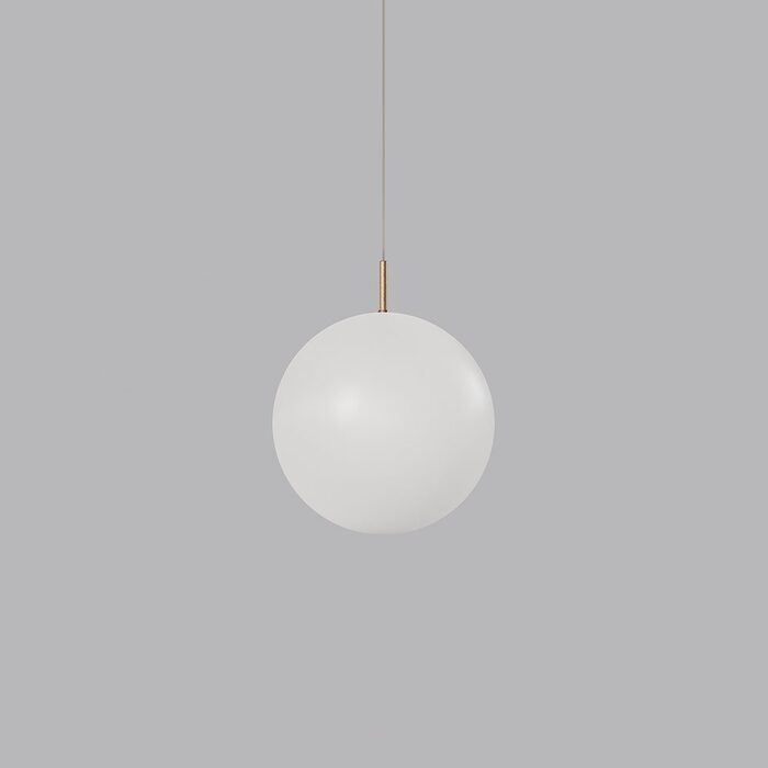 A refined brass rod intersects the sphere, housing a radiant dimmable LED light source.