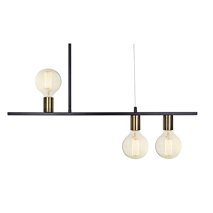 Contemporary 3 light pendant with an adjustable suspension rod, (500, 400, 300 and 150mm segments totalling 1500mm), Black rod and Satin Brass lamp holders.