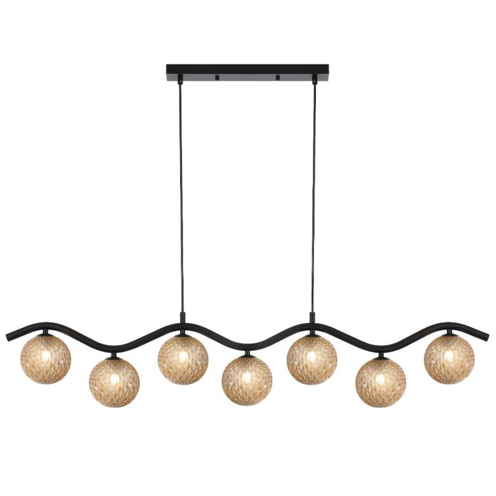 The Orton 7 light pendant is a chic and distinctive lighting fixture with a wavy frame which is available in antique gold or black.