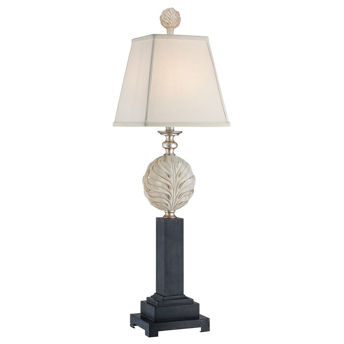 Table lamp in Silver and Black finishes with Antique Ivory leaf ornament, including White square linen shade with trim.