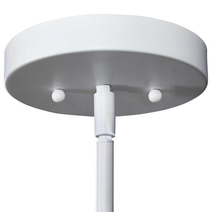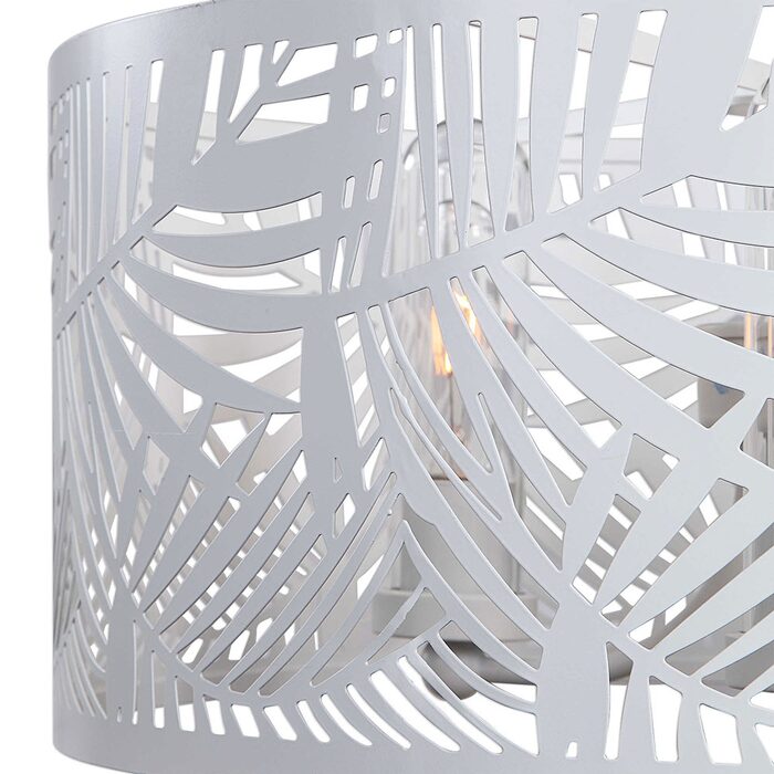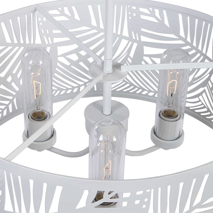 In a Palm leaf cut out design with a White powder coat finish and clear glass dome shades.