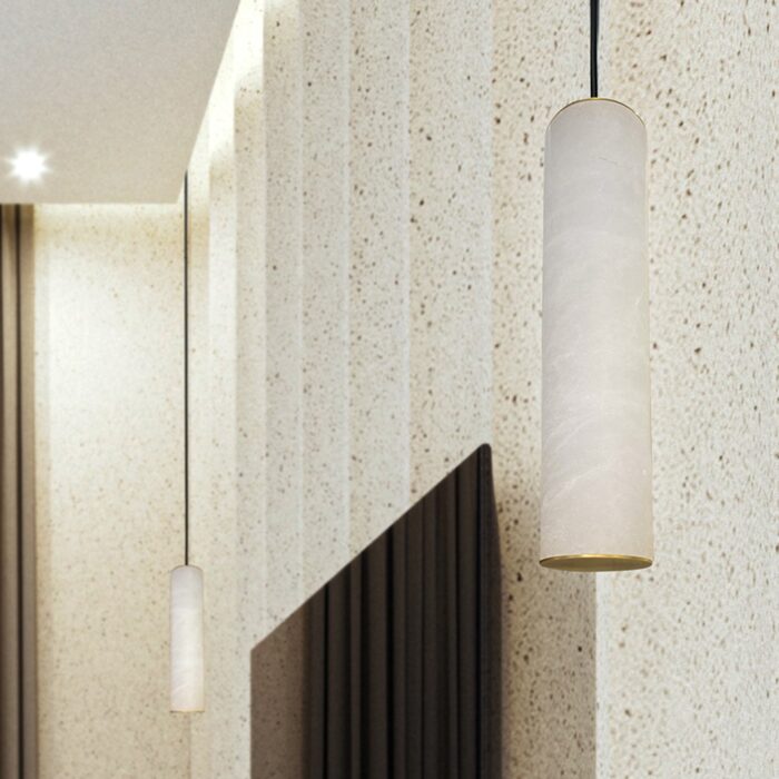 Slim and graceful, with dimensions, this pendant offers a delicate presence that belies its robust construction from metal and genuine marble.