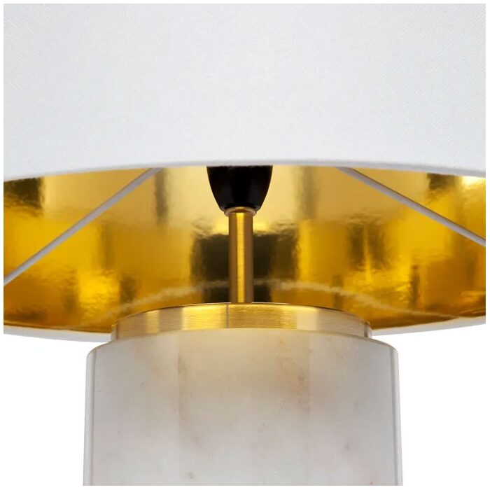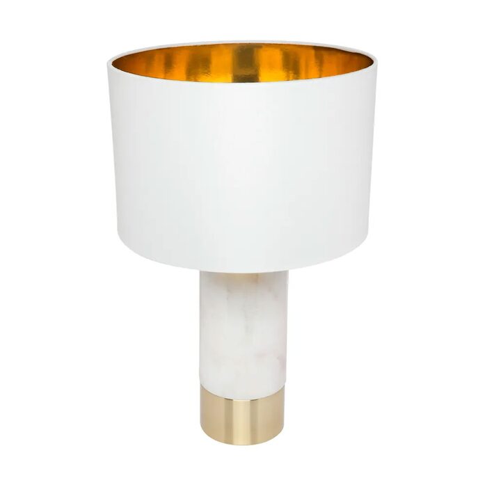 Divine white marble table lamp sitting proudly on a gold base with black linen shade with gold reflective pvc lining.