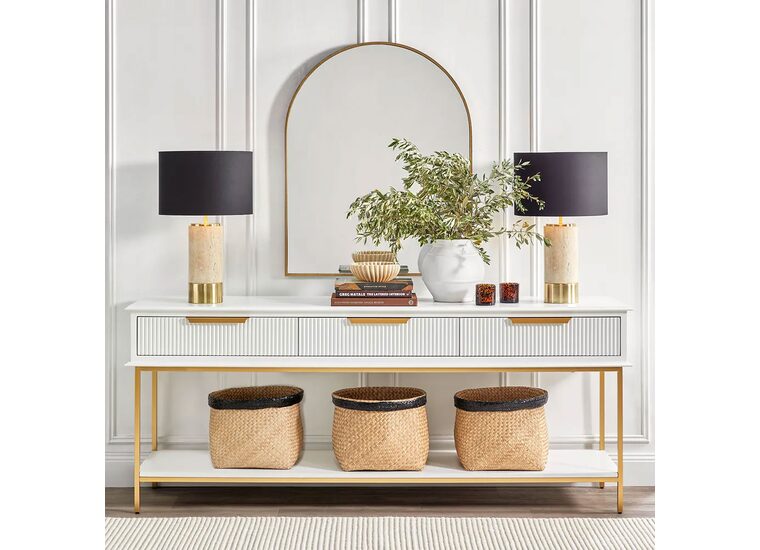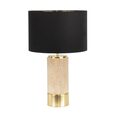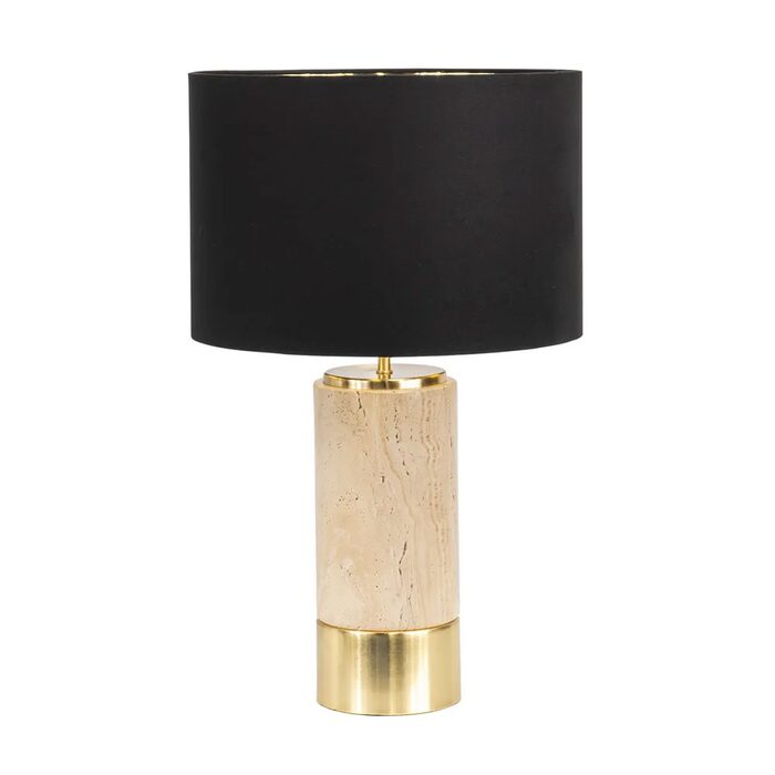 Unpretentious luxury, our Paola table lamp features a divine natural travertine and brass finished cylindrical base atop with a dramatic black linen drum shade and gold reflective pvc lining.
