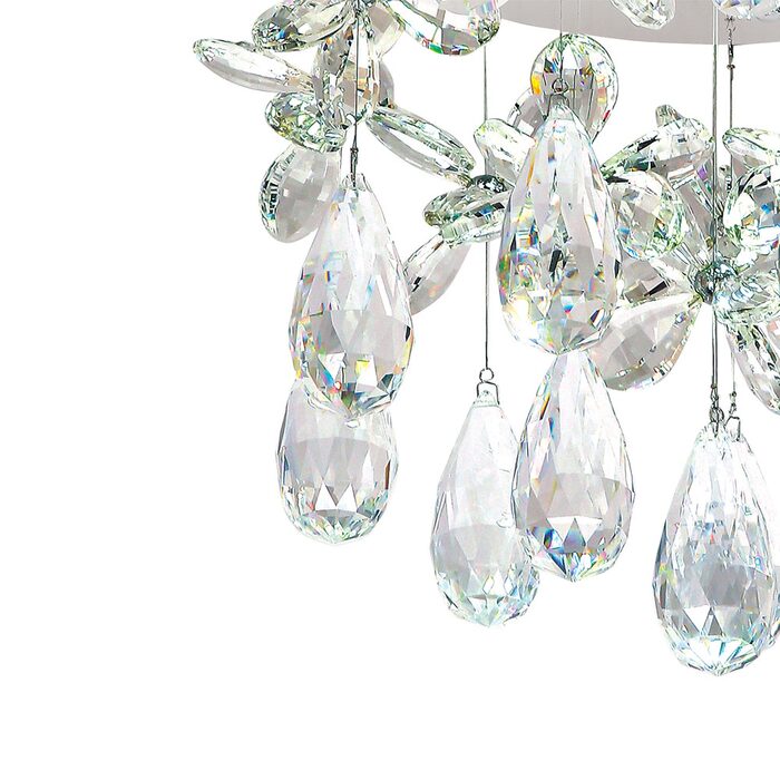 The Paradis Round Crystal collection makes an opulent statement with lavish crystals and glowing LED Light. Dramatic baskets and waterfalls of hand-polished crystal bowtie clusters with sparkling teardrops suspended from the ceiling, shimmering light through each strand. The fixture is pre-trimmed with the crystal strands of fixed lengths, mounted to a precision-cut stainless steel ceiling plate.