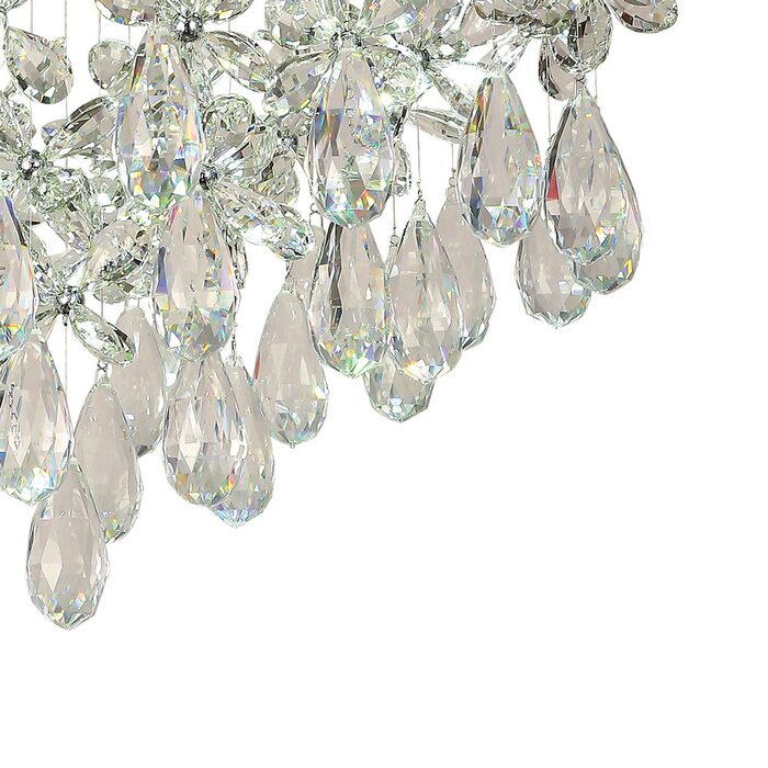 The Paradis Round Crystal collection makes an opulent statement with lavish crystals and glowing LED Light. Dramatic baskets and waterfalls of hand-polished crystal bowtie clusters with sparkling teardrops suspended from the ceiling, shimmering light through each strand. The fixture is pre-trimmed with the crystal strands of fixed lengths, mounted to a precision-cut stainless steel ceiling plate.