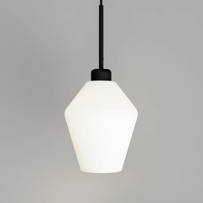 The compact suspension is sleek and contemporary while the shade features a geometric shape that has been streamlined by its smooth curves to counteract its angularity.