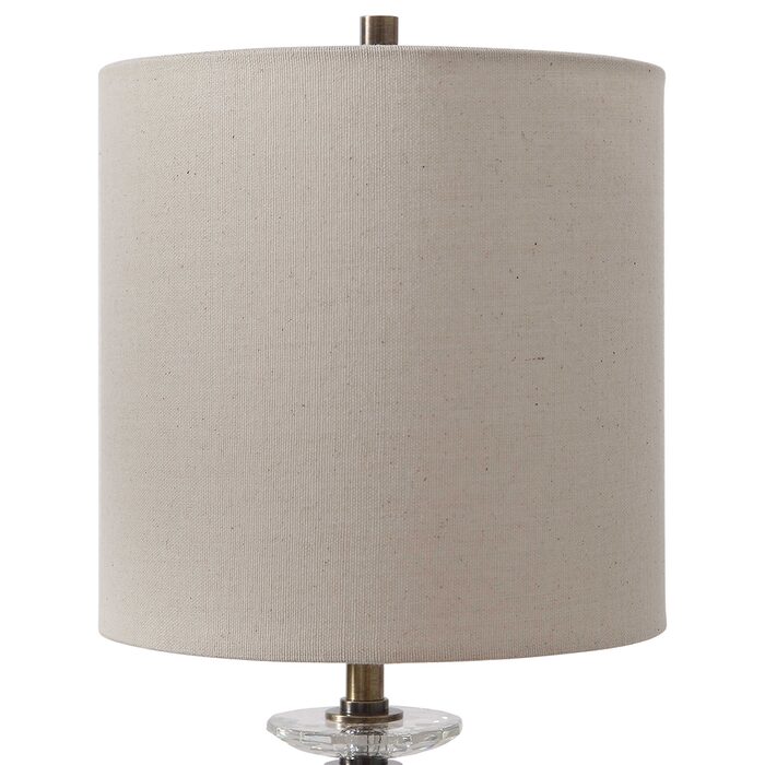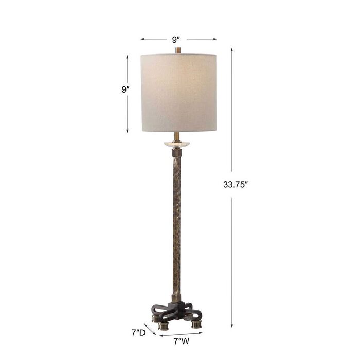 This buffet lamp has a rustic industrial feel featuring a hammered steel base with a heavily antiqued brass plated finish, paired with a rust black foot with crystal accent.