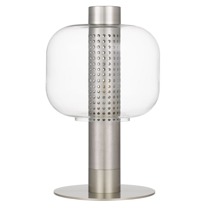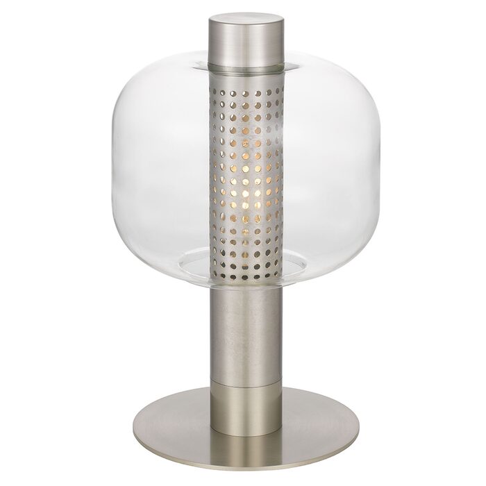 Carefully created mouth-blown glass sits atop an oversized metal tube that hides the light source.