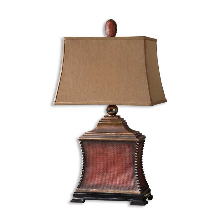 Aged red finish over a woven textured base with antiqued silver beaded accents, matte black foot and heavily antiqued gold details. The rectangle, semi bell shade is a silken rust taupe fabric.