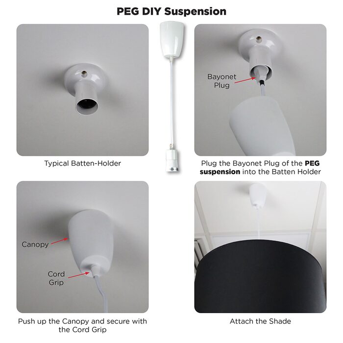 DIY B22 suspension designed to easily plug into (and cover) your existing batten holder, giving you an instant suspension suitable for light weight shades.