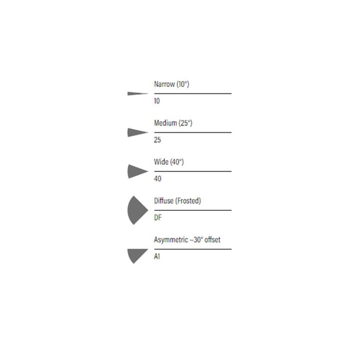 - Beam: 10° / 25° / 40° / Diffuse Frosted (DF) / Asymmetric ~30° offset (A1)