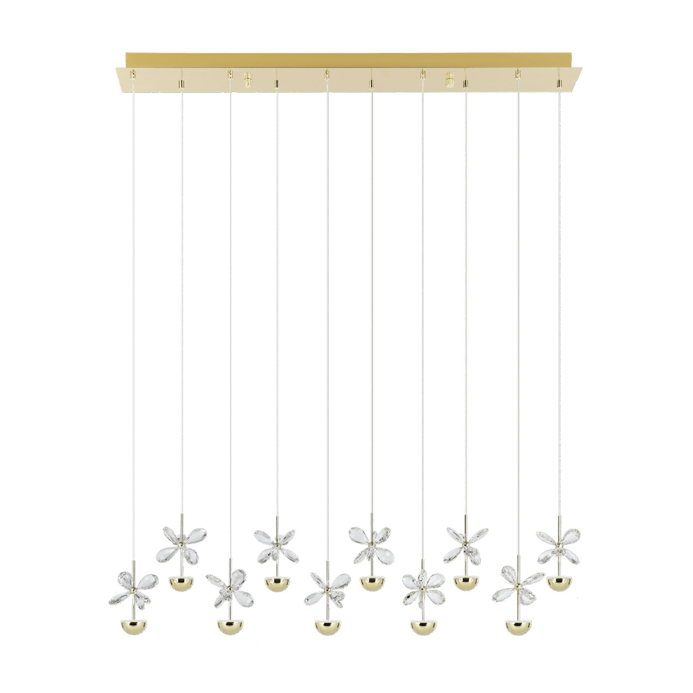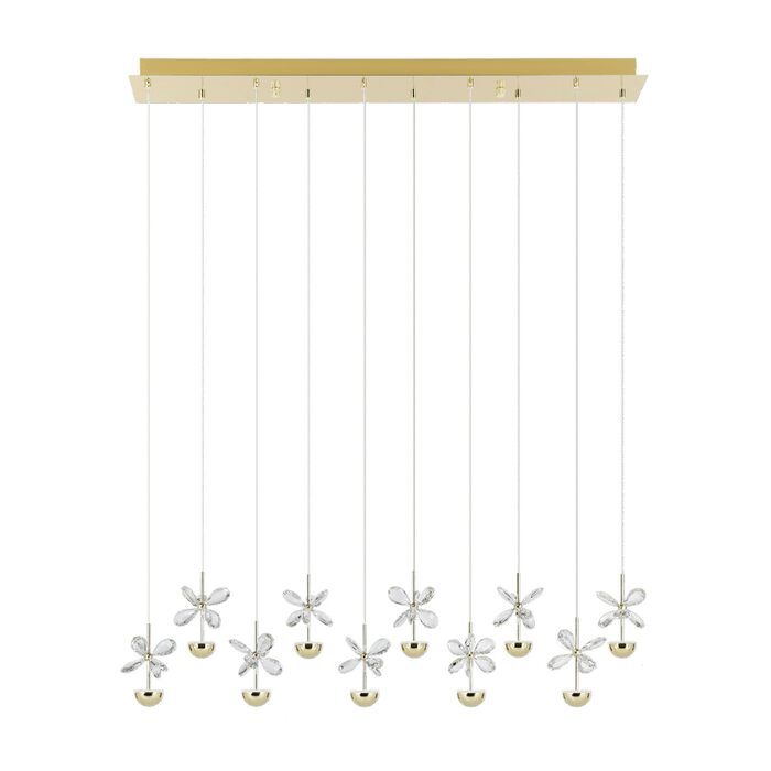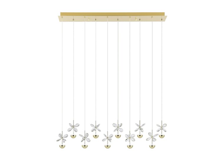The PIANOPOLI 3 pendant light has ten decorative flower-inspired light elements on clear cables suspended from an elongated brass metal canopy.