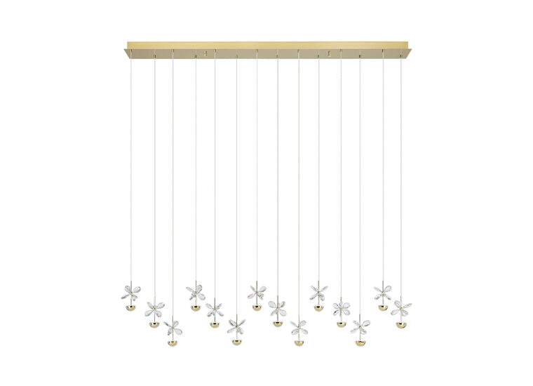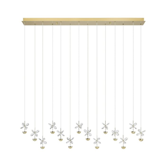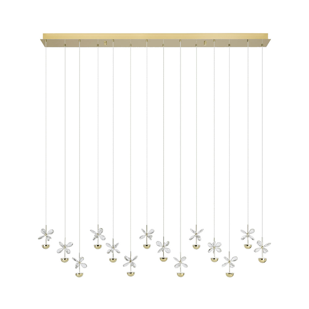 The PIANOPOLI 3 pendant light has fourteen decorative flower-inspired light elements on clear cables suspended from an elongated brass metal canopy.