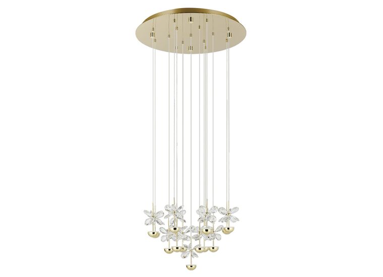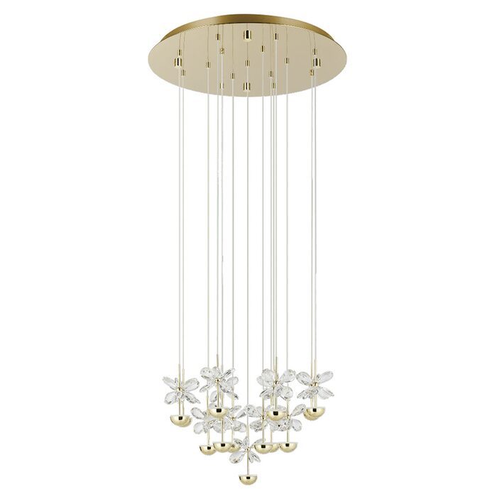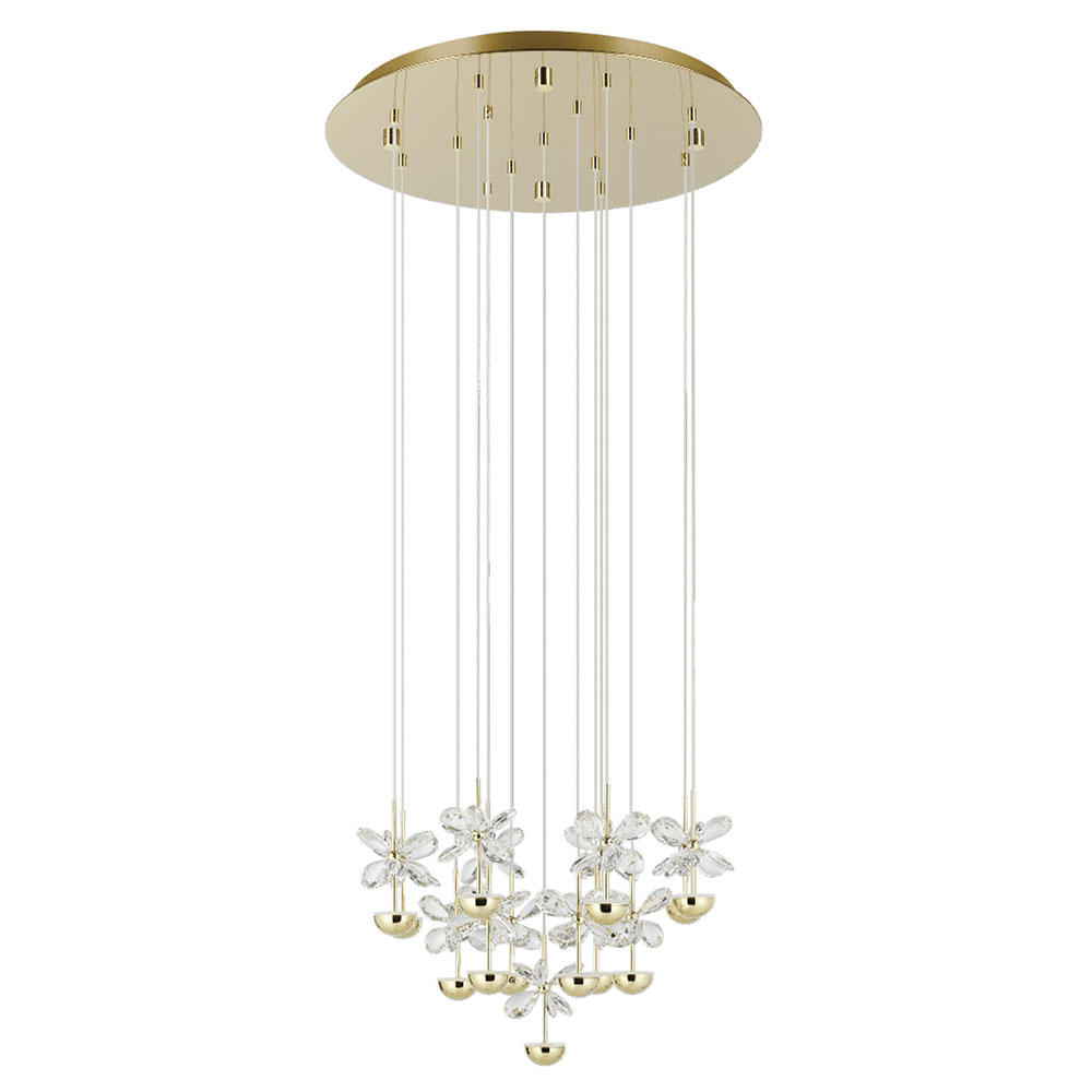 The PIANOPOLI 3 pendant light features fifteen decorative flower-inspired light elements on clear cables suspended from a round brass metal canopy.
