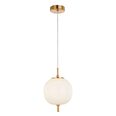 A long and thin wire drops down from the ceiling and leads to a gleaming rod finial and the large, white cased glass shade.