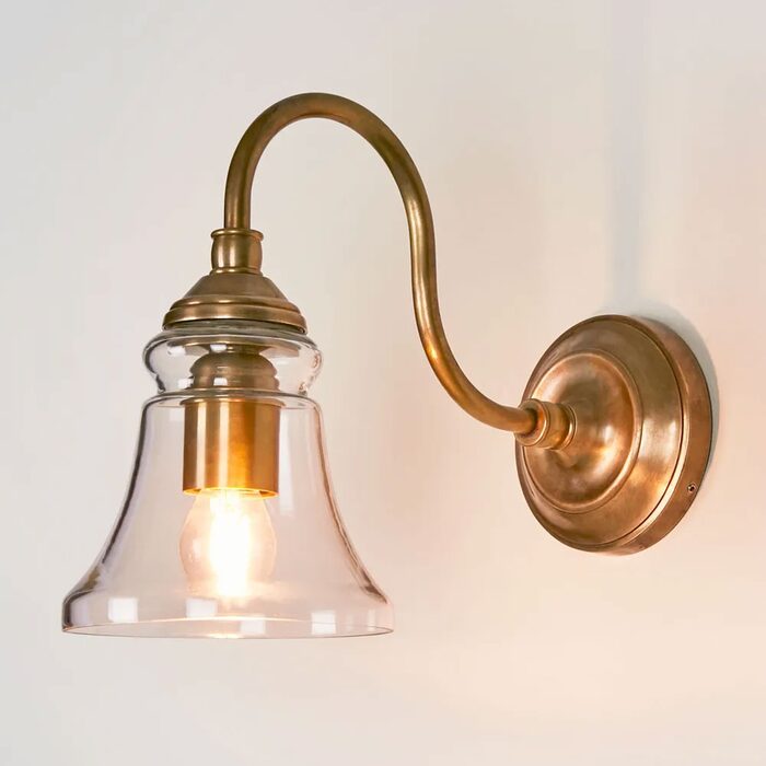 This quality brass wall light with natural tarnish is fixed to the wall on circular aged brass back plate and has decorative curved arm which carries the light.