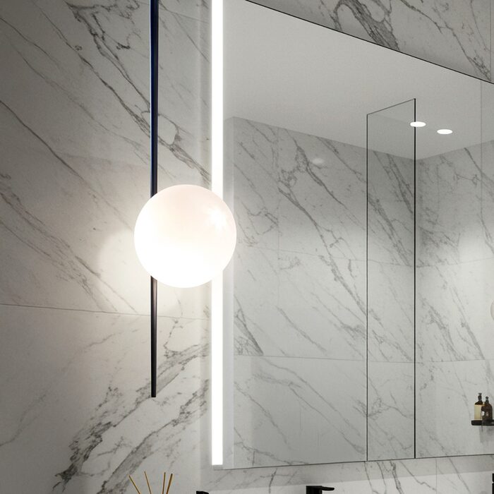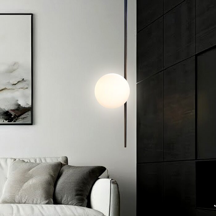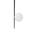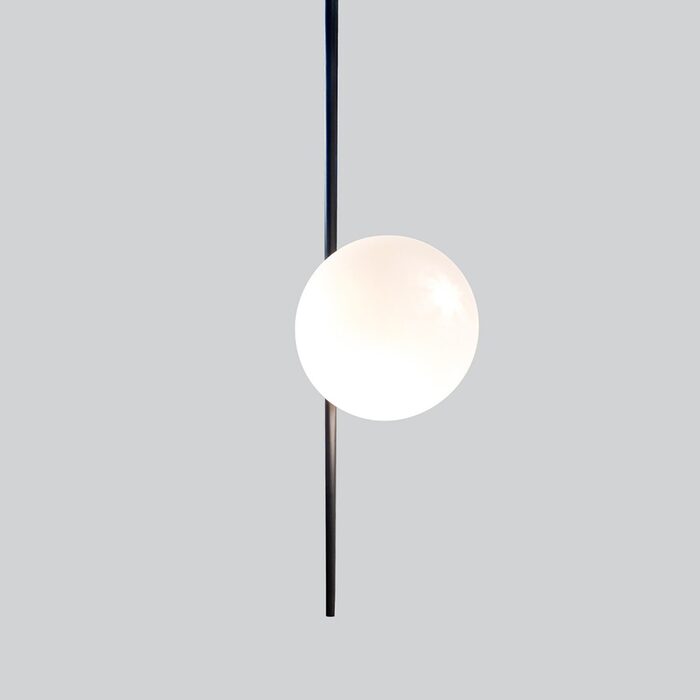 Its beautifully positioned opal matte glass sphere appears to float delicately along the slender rod, creating a mesmerizing visual effect.