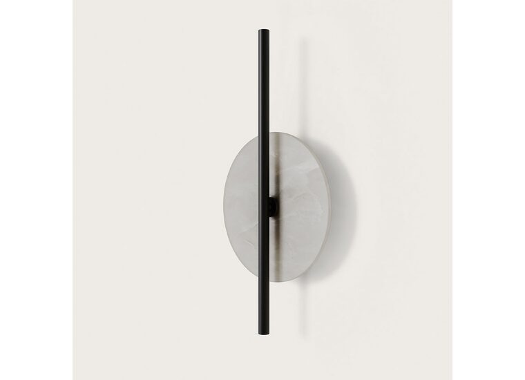 Point Wall Light by Aromas embodies balance and symmetry, combining a refined alabaster disc with a slim, cylindrical light source.