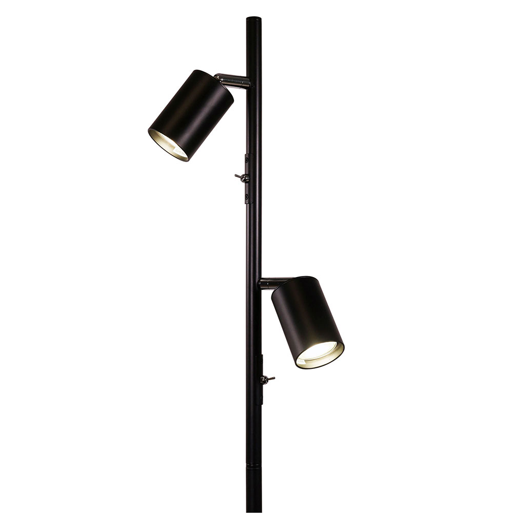 The PONTE twin floor lamp features 2 adjustable spotlights with individual switches conveniently located on the body of the lamp, allowing for independent use.