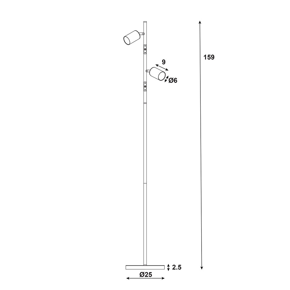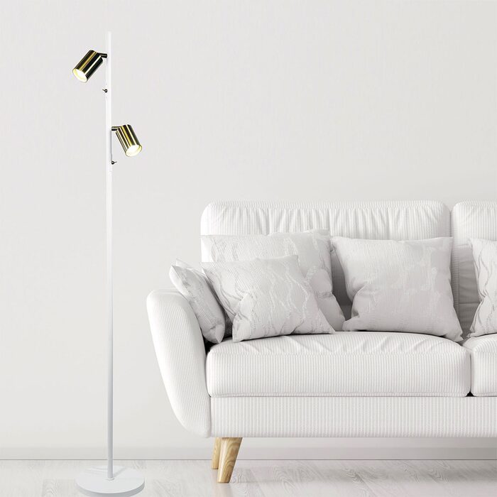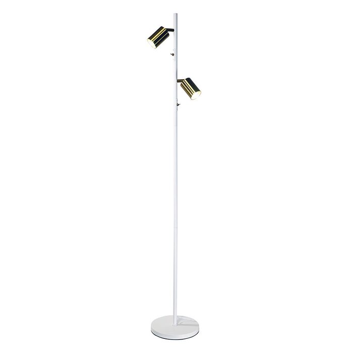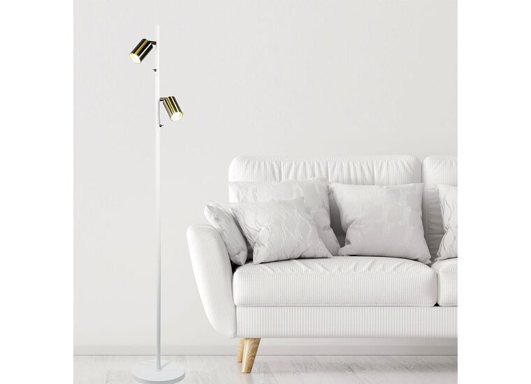 The PONTE twin floor lamp features 2 adjustable spotlights with individual switches conveniently located on the body of the lamp, allowing for independent use.