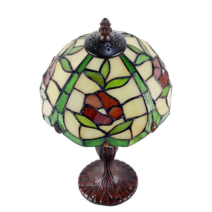 This beautiful Tiffany lamp features a handcrafted, genuine stained art glass shade combined with a resin base, carved in a traditional design with a brown neutral colour to juxtapose the lively art glass shade for maximum impact.