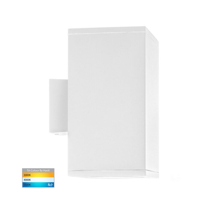 The Havit HV3629T-WHT-SQ Porter is a large, square, White powder-coated aluminium up-and-down LED wall light featuring Tri-colour technology (3000K-5500K), dimmable 2x15W LEDs, and an IP54 rating.