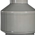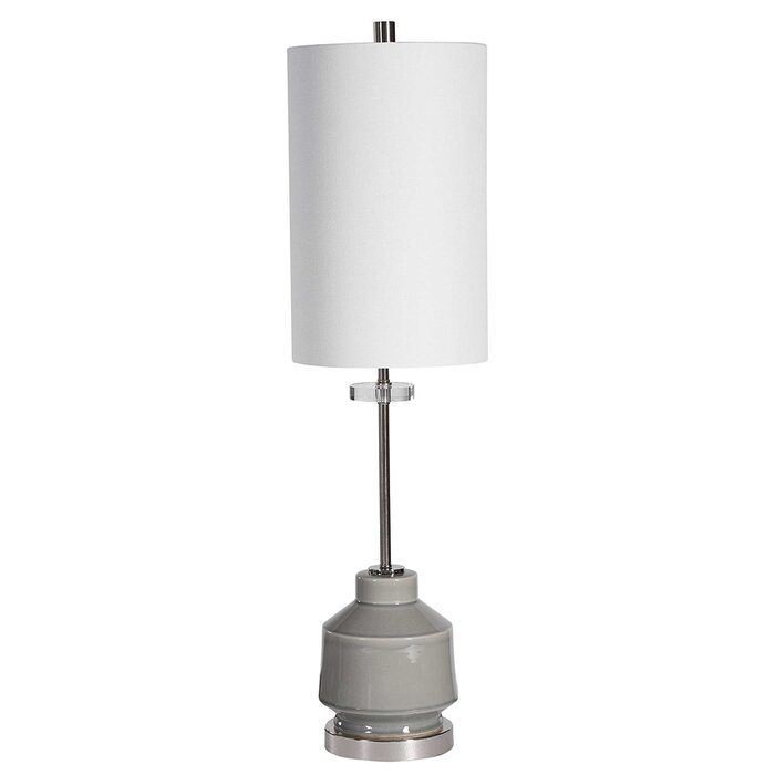 This elegant buffet lamp features a clean geometric shaped ceramic base finished in a warm gray glaze, accented by polished nickel plated iron details and crystal accents.