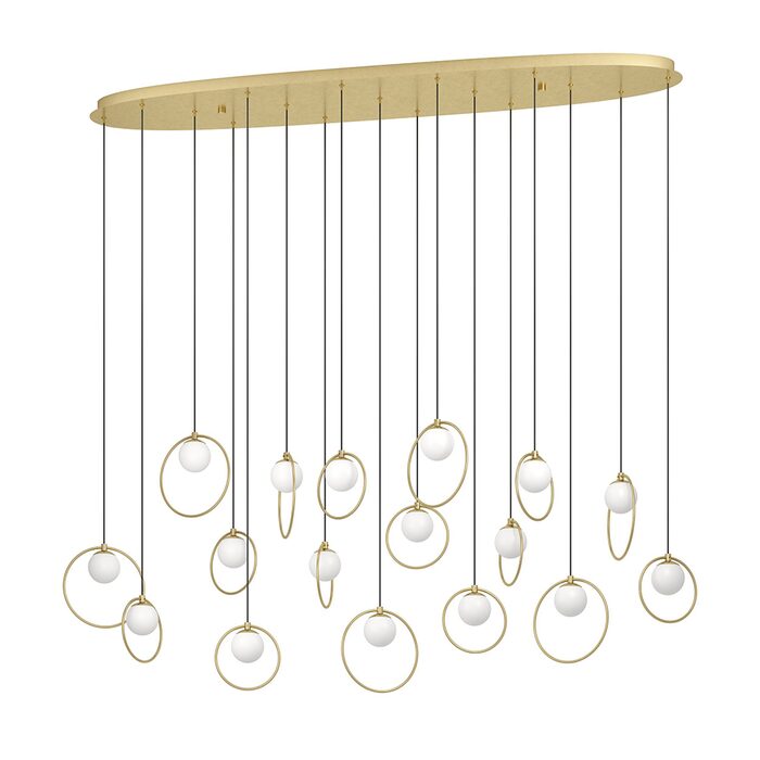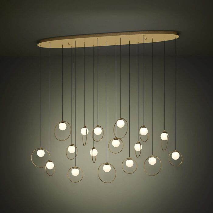 Featuring brass matt rings encircling matt-opal glass spheres, all suspended from a sleek brass canopy.
