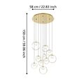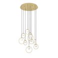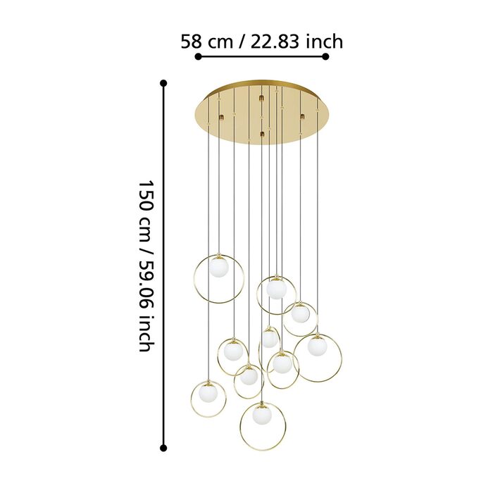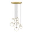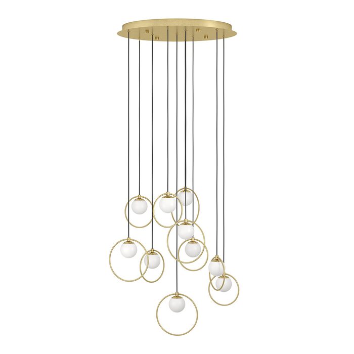 Featuring brass matt rings encircling matt-opal glass spheres, all suspended from a sleek brass canopy.