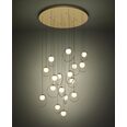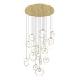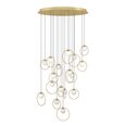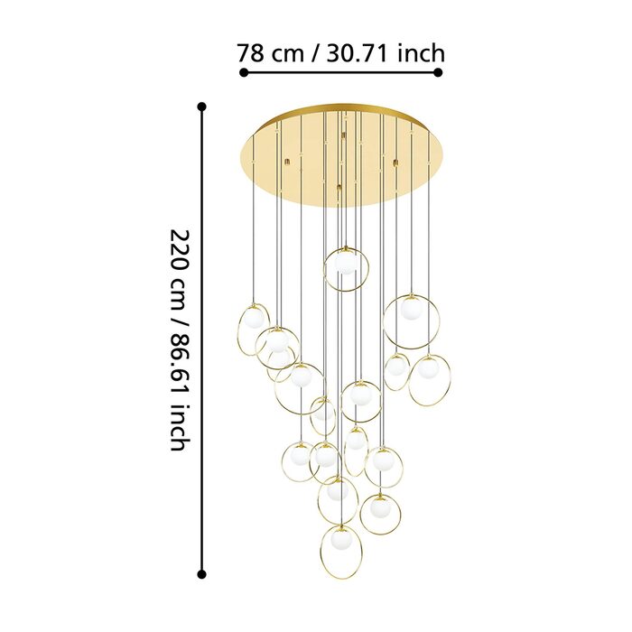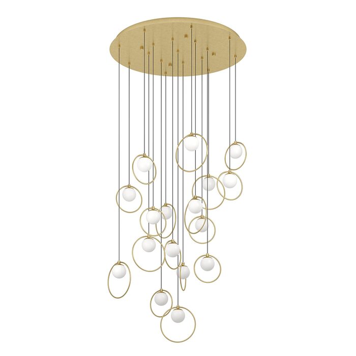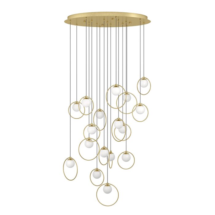 Featuring brass matt rings encircling matt-opal glass spheres, all suspended from a sleek brass canopy.