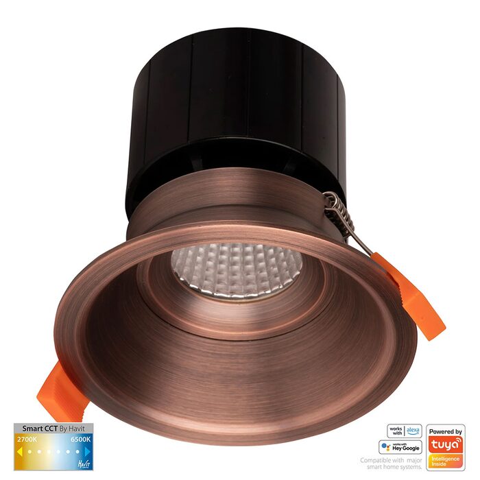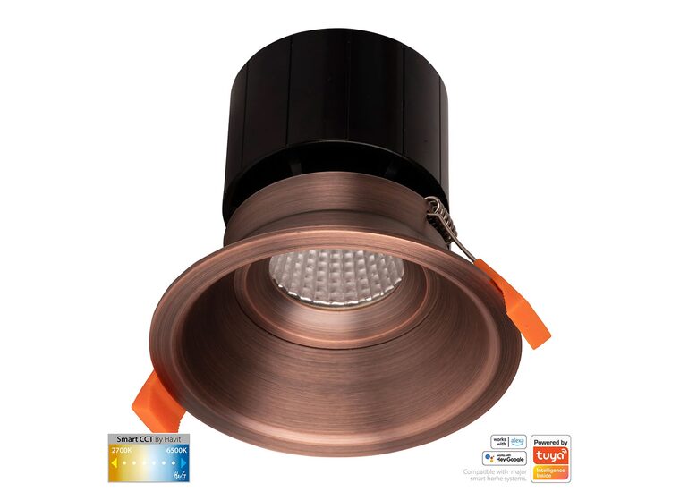 The Havit HV5514CCT-AB is a 12W smart, WiFi-enabled, fixed, deep-recessed LED downlight in a Antique Brass finish, featuring adjustable CCT (2700K-6500K) and app control via TUYA.