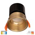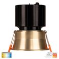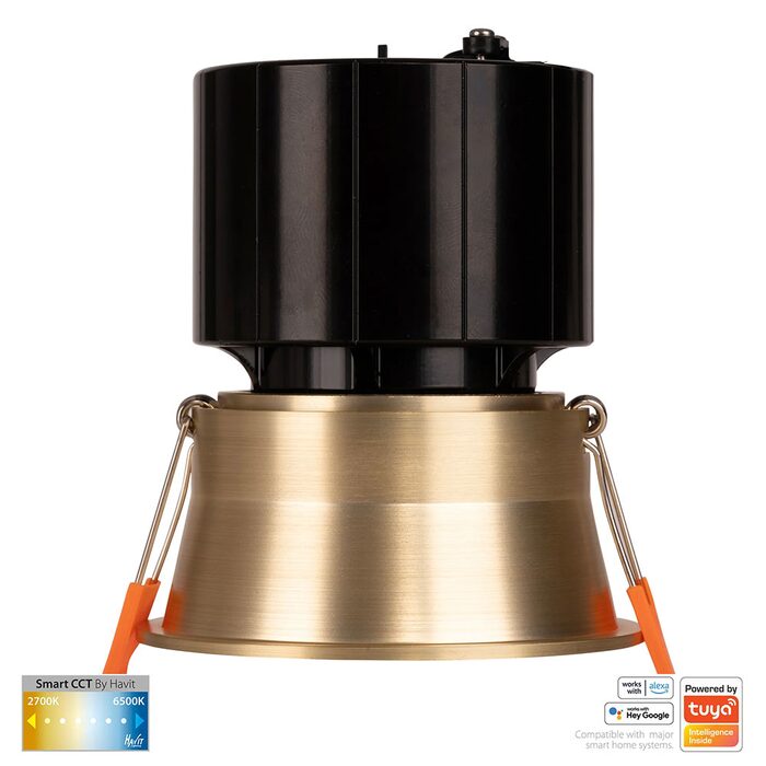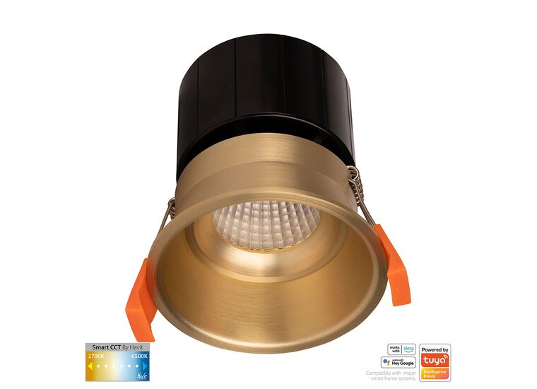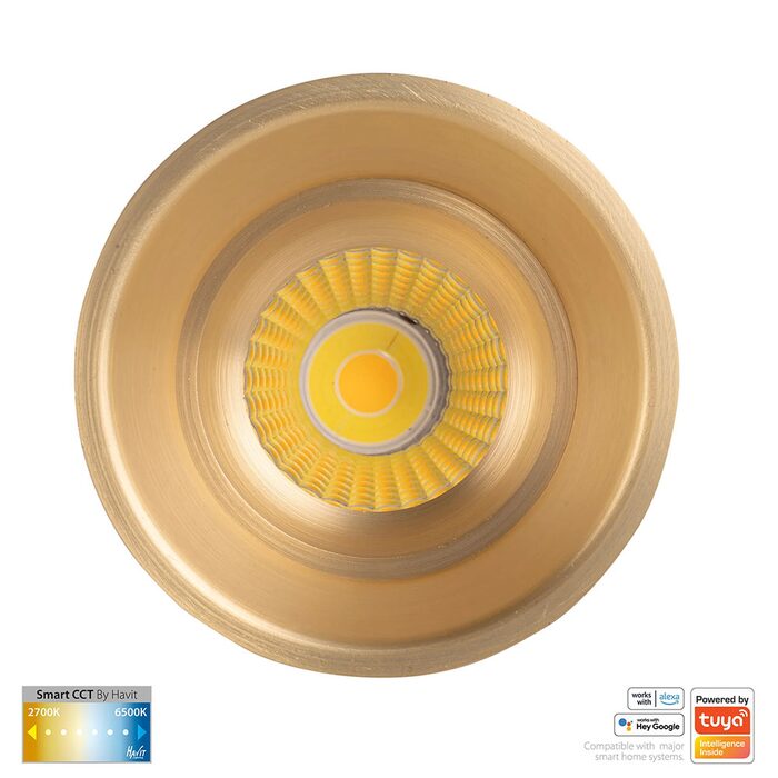 The HV5513CCT-BR is a Havit Prime Fixed Deep CCT WIFI LED Downlight in Brass, a smart, recessed light with a 12W built-in LED, adjustable color temperature (2700K-6500K) via the TUYA App, 60° beam angle, and high CRI (≥90).