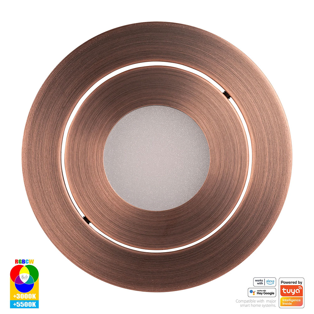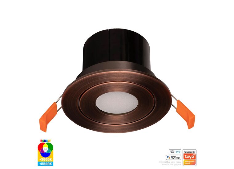 The HV5512RGBCW-AB is a Havit Prime Smart Aluminium Tilt RGBCW Wi-Fi LED Downlight with an Antique Brass finish.