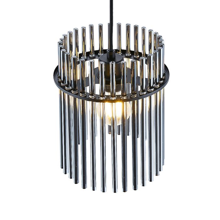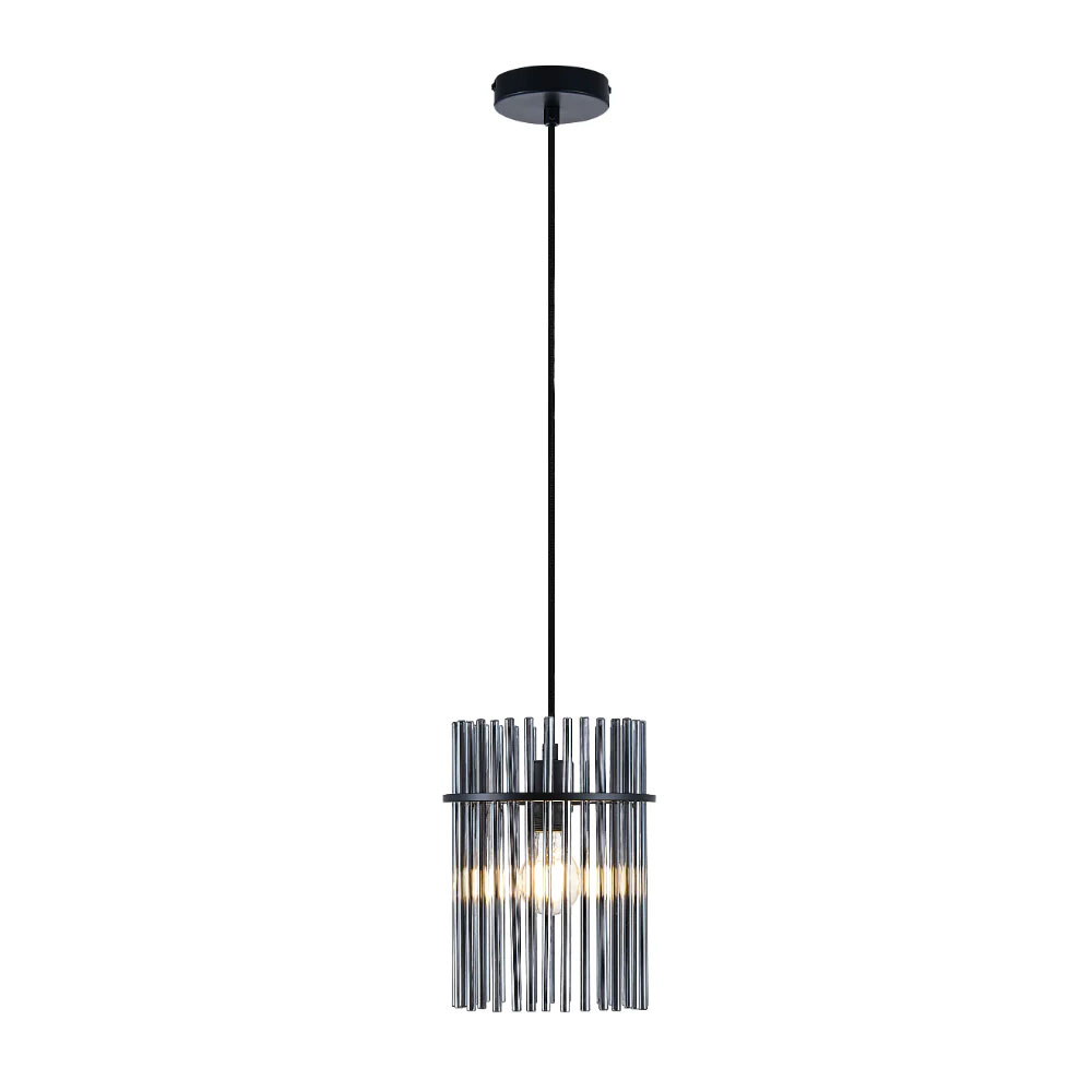 Each piece features a shade crafted from sleek glass rods in a sophisticated smoke colour, creating a mesmerizing effect when illuminated.