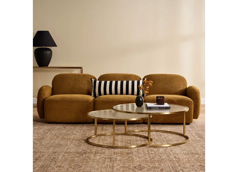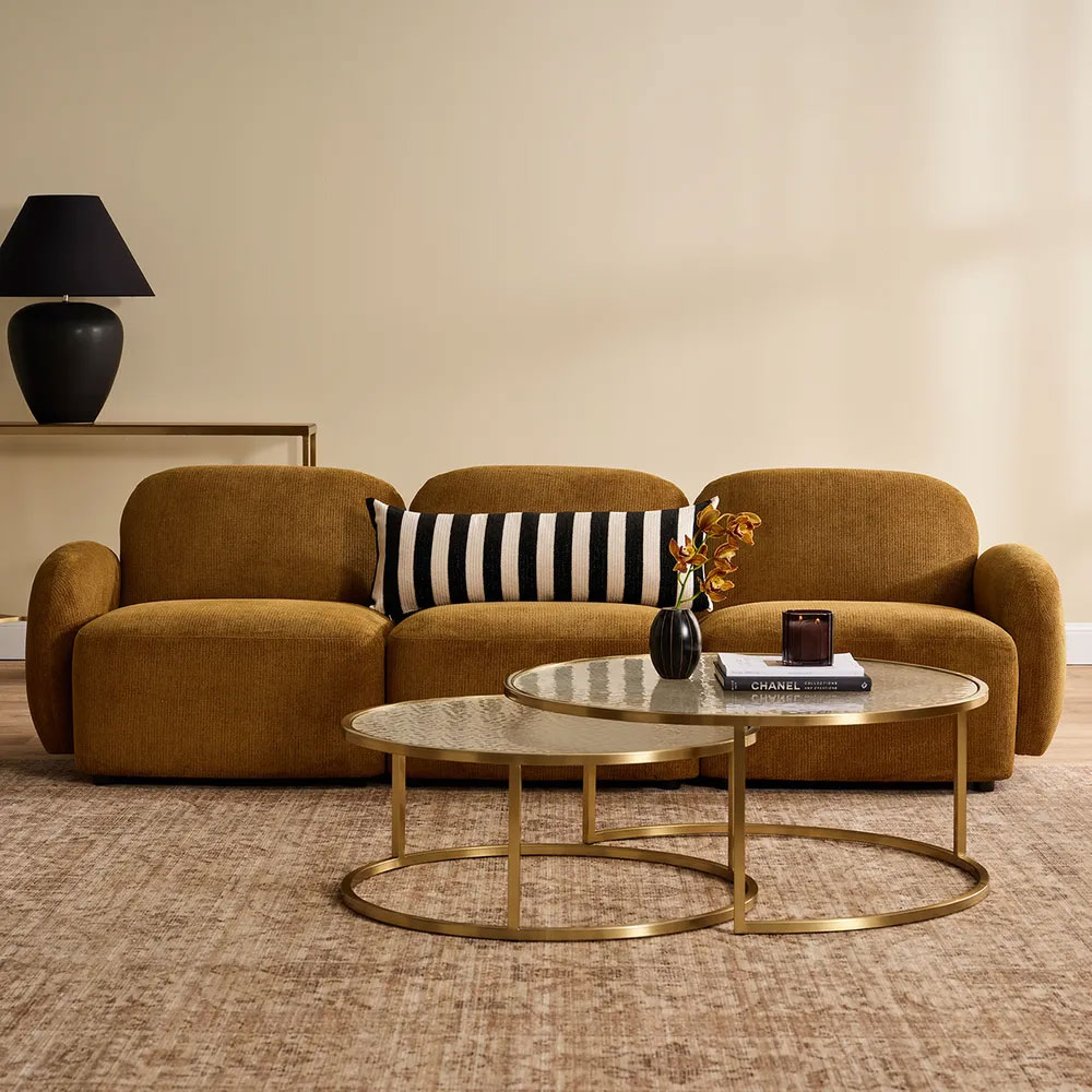 Wrapped in a rich toffee chenille, this sculptural seating range balances bold form with luxurious comfort.