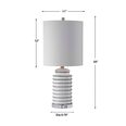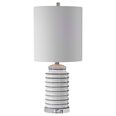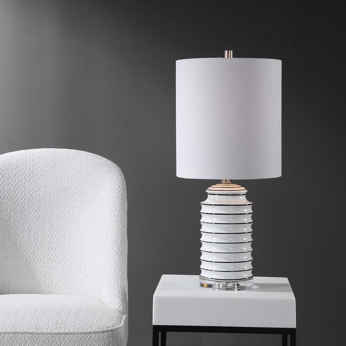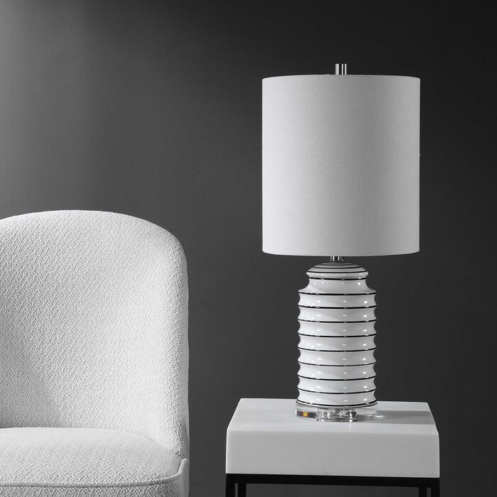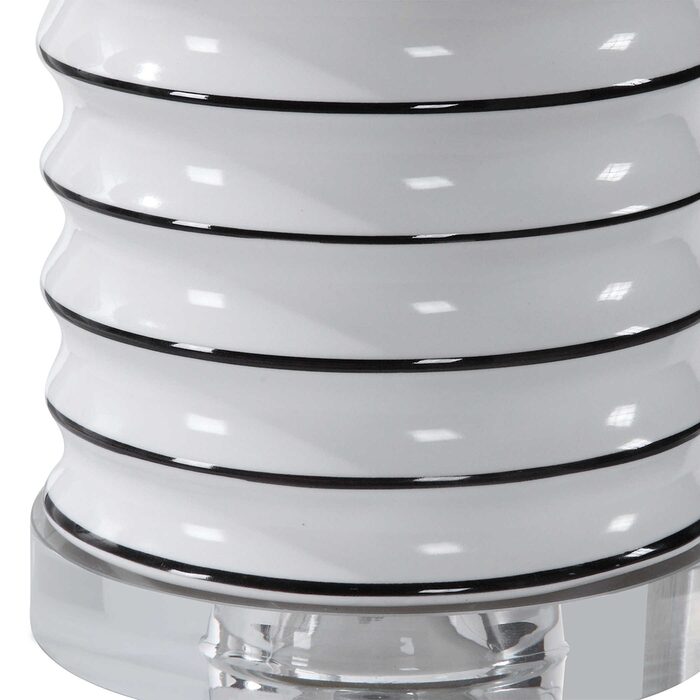 This ceramic lamp features a gloss white ribbed base tipped with bold black stripes, accented with brushed nickel details and a thick crystal foot.