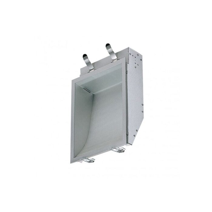 A recessed deflector light with a Silver paint finish and Frosted Glass lens.