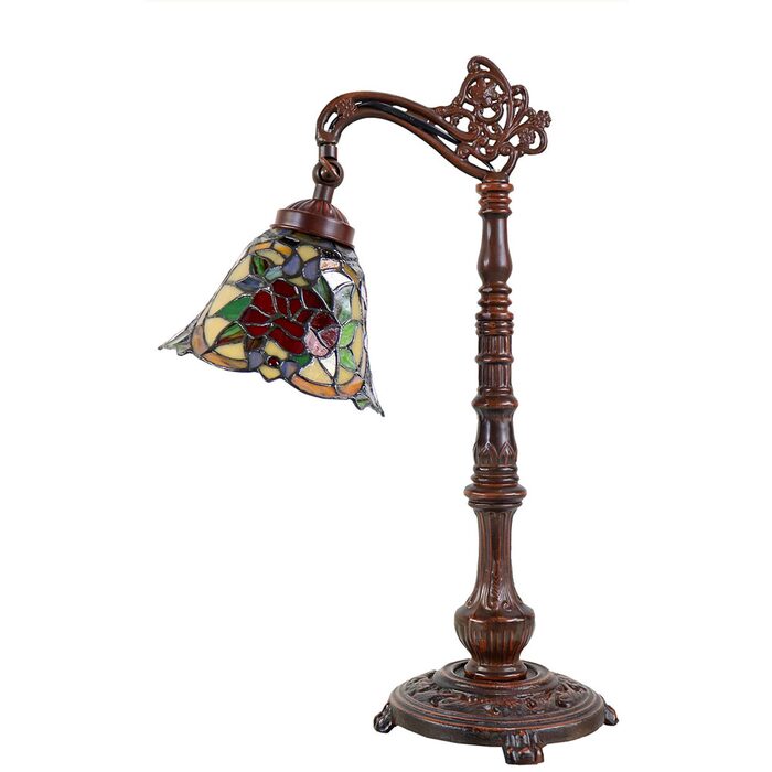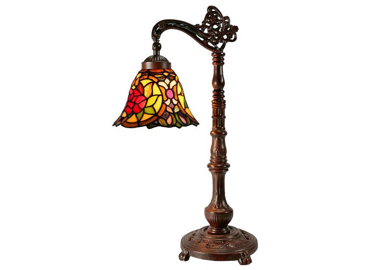 The Red Camellia lamp is a colourful Tiffany style lamp that combines many pieces of art glass to create a stunning and complex design.