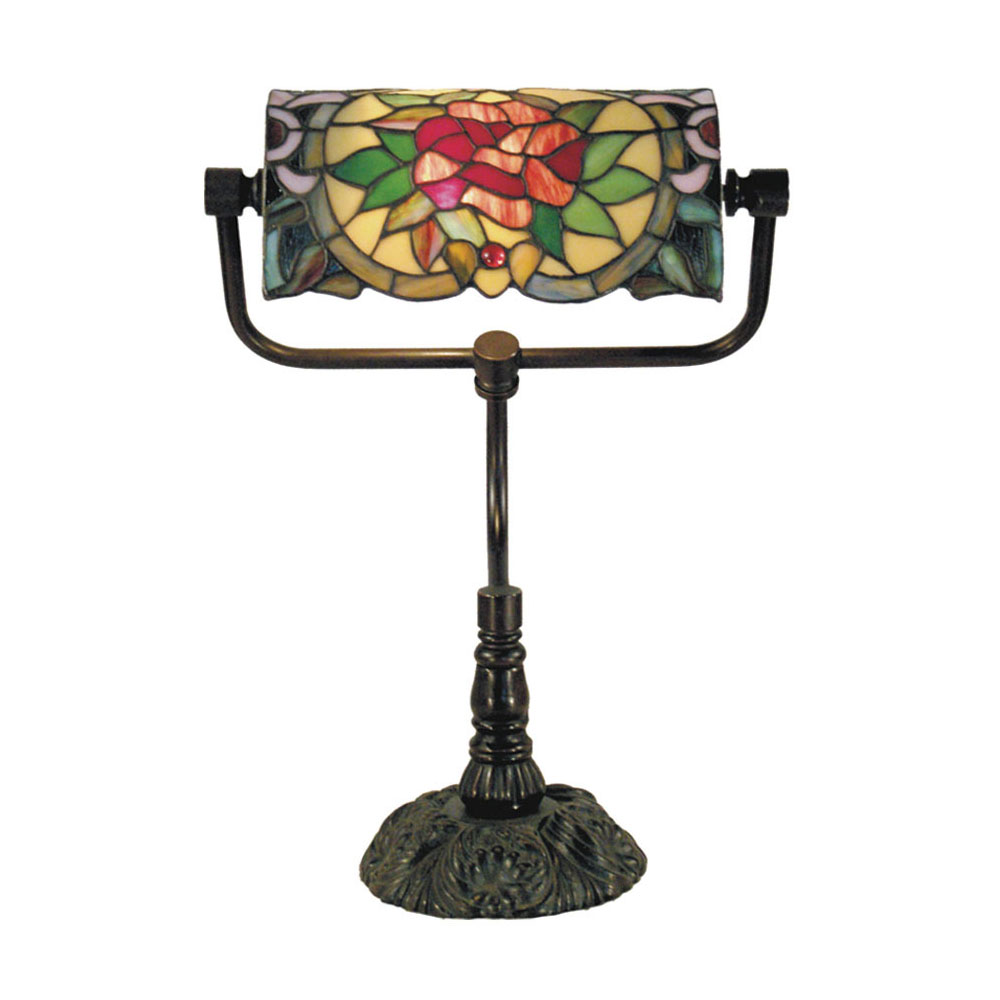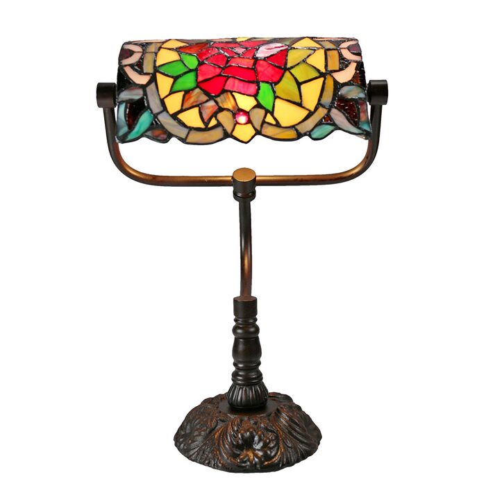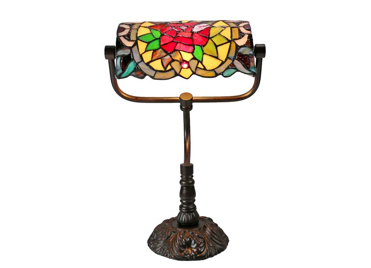 This beautiful table lamp features a handcrafted, genuine Red Camellia design on stained art glass shade combined with the traditional banker lamp shape, carved in a traditional design with a dark neutral colour to juxtapose the lively art glass shade for maximum impact.
