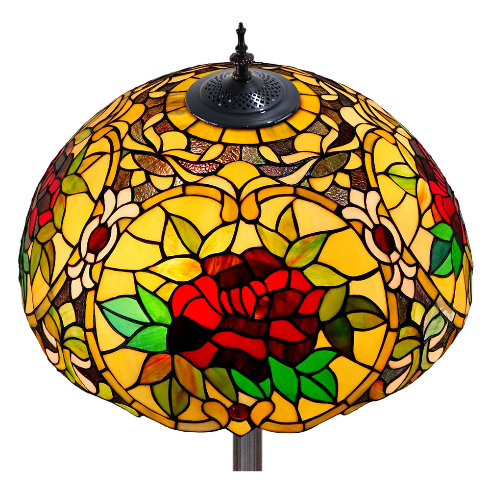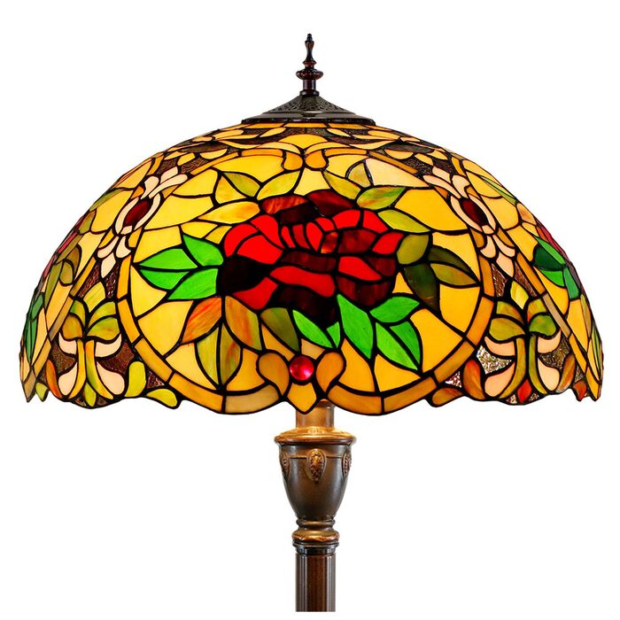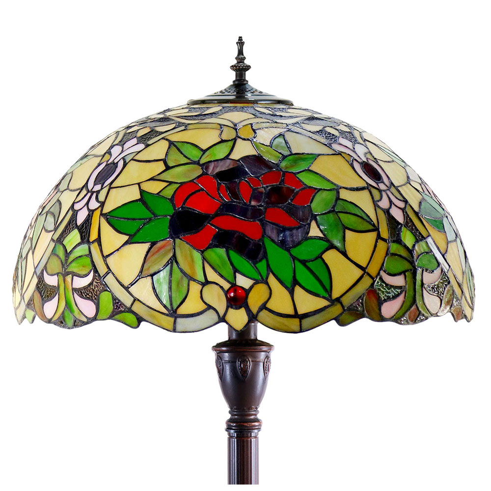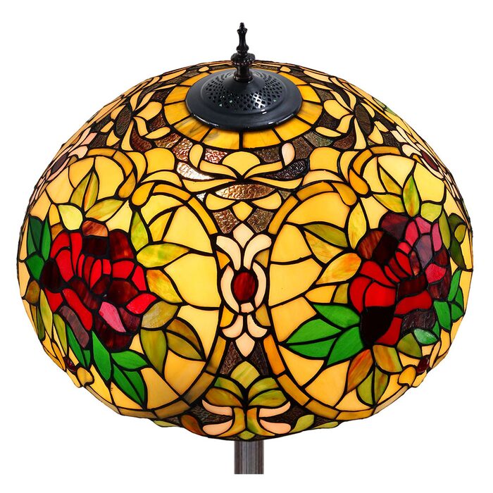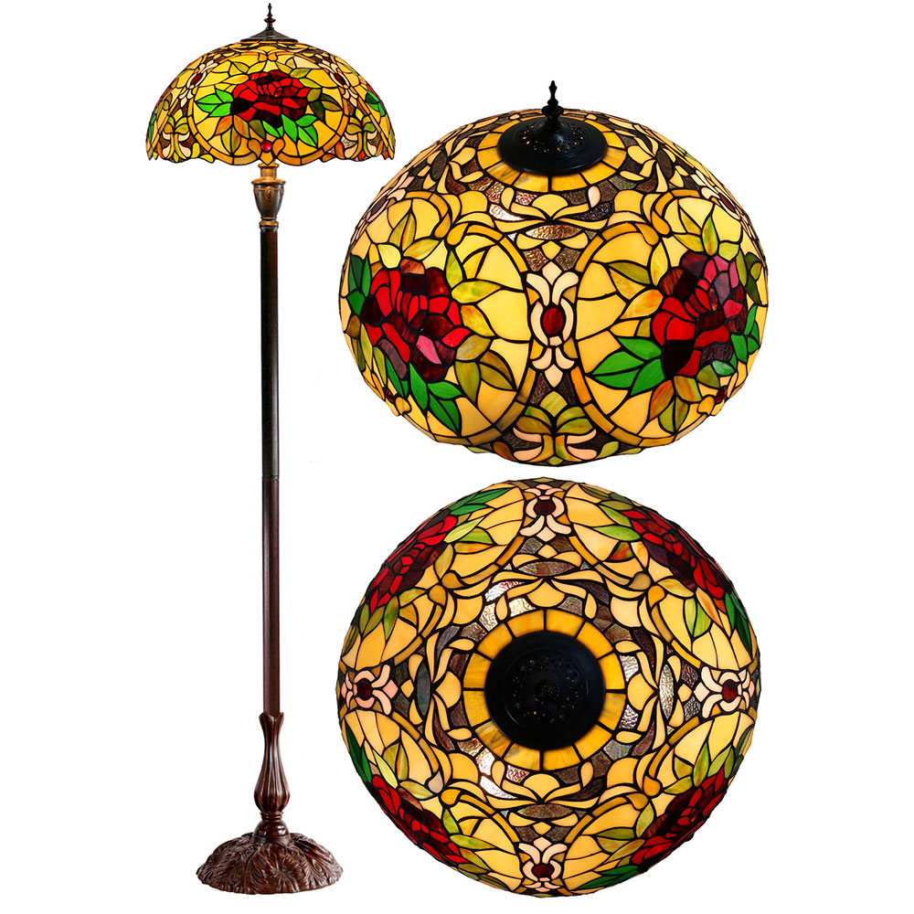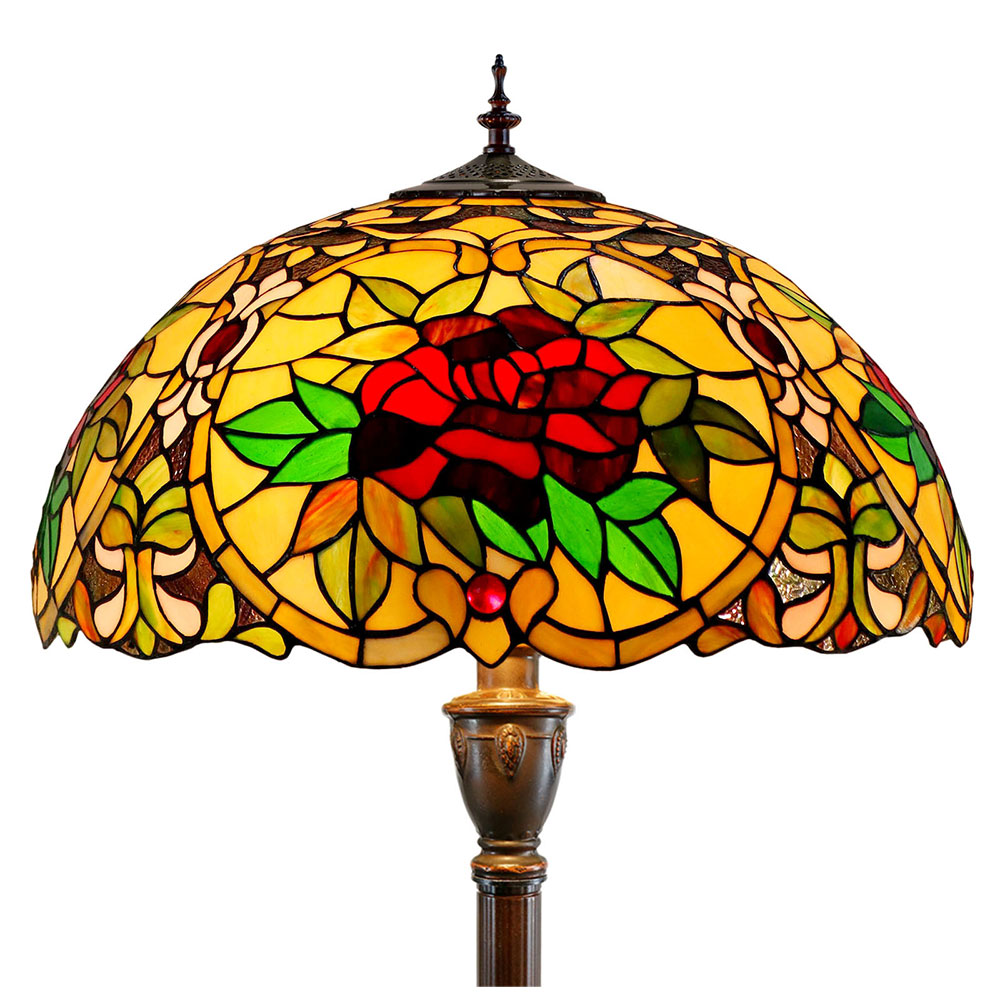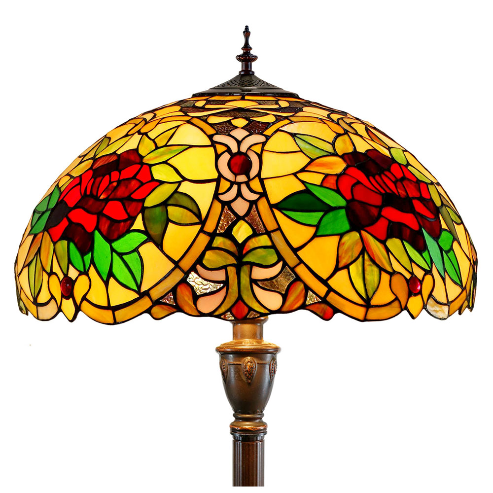 This beautiful floor lamp features a handcrafted, genuine red camellia design on stained art glass shade combined with beautiful base and frame made of resin.